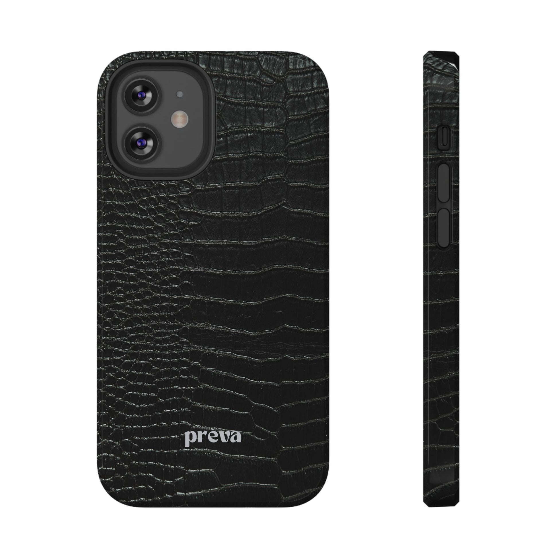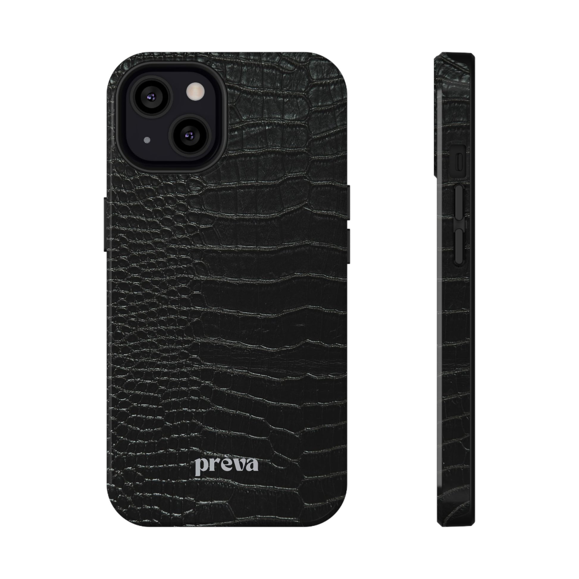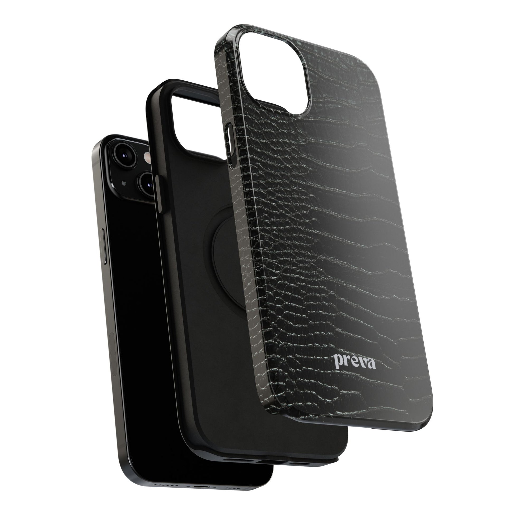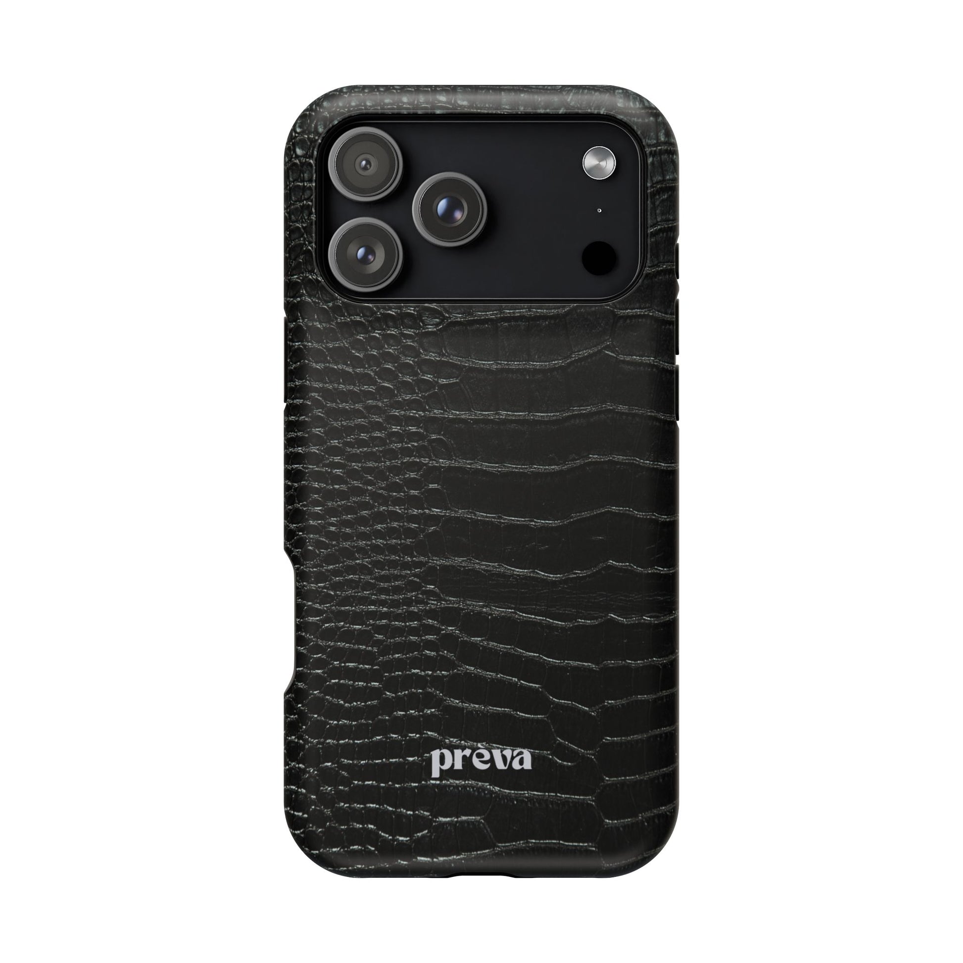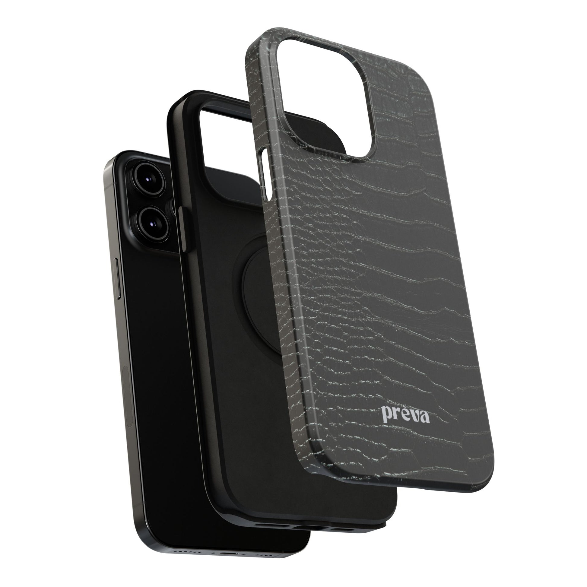 This slim, impact-resistant phone case brings understated luxury to everyday carry. The black crocodile-embossed finish reads like wearable leather, while the dual-layer construction—rigid polycarbonate shell with a removable TPU liner—gives confidence against drops and scuffs. Full-wrap printing keeps the textured pattern seamless around edges. Choose a glossy sheen for a sleek, reflective look or a matte finish for muted sophistication. It’s crafted for tactile grip, supports wireless charging, and fits the latest iPhone models so your device looks refined and stays protected without bulk.