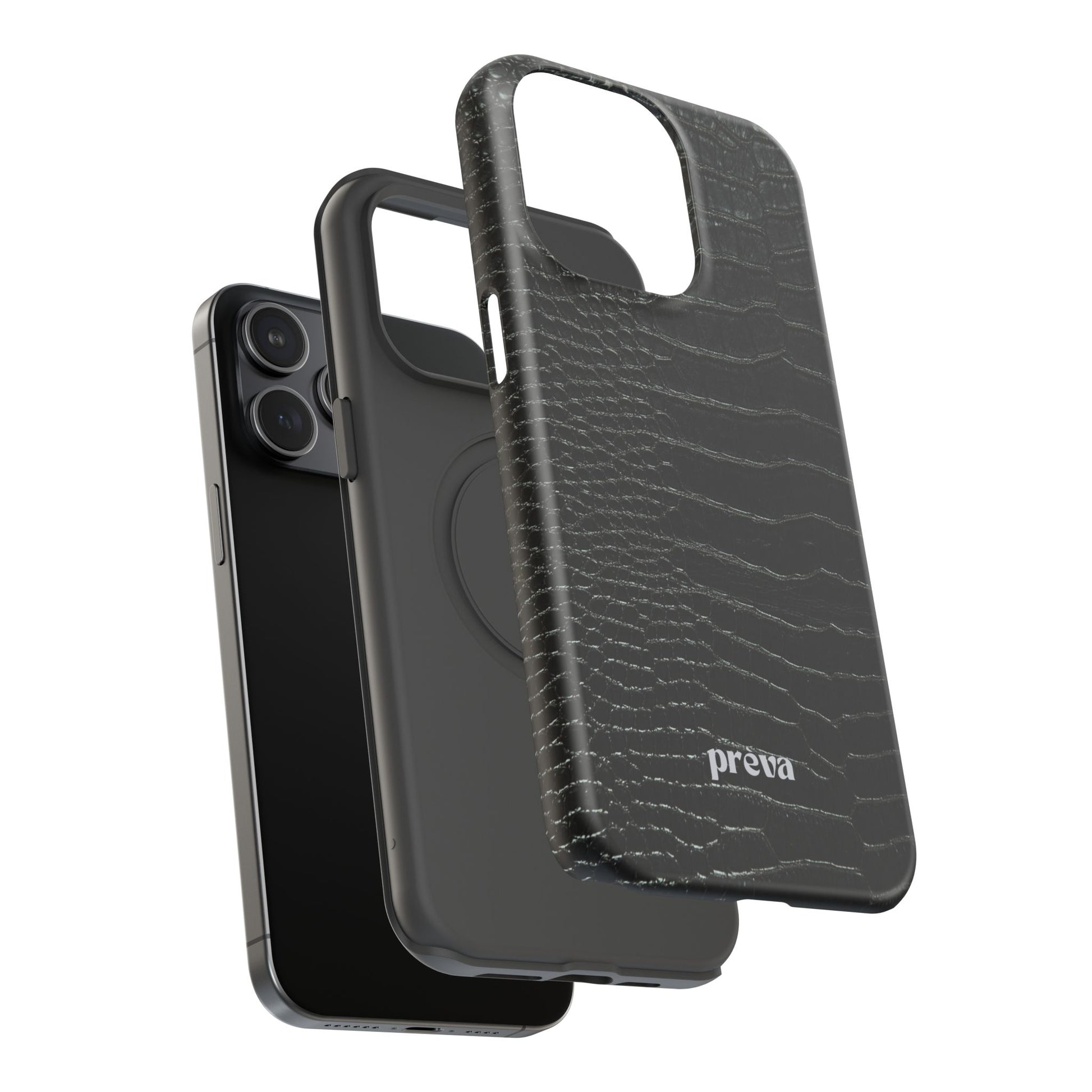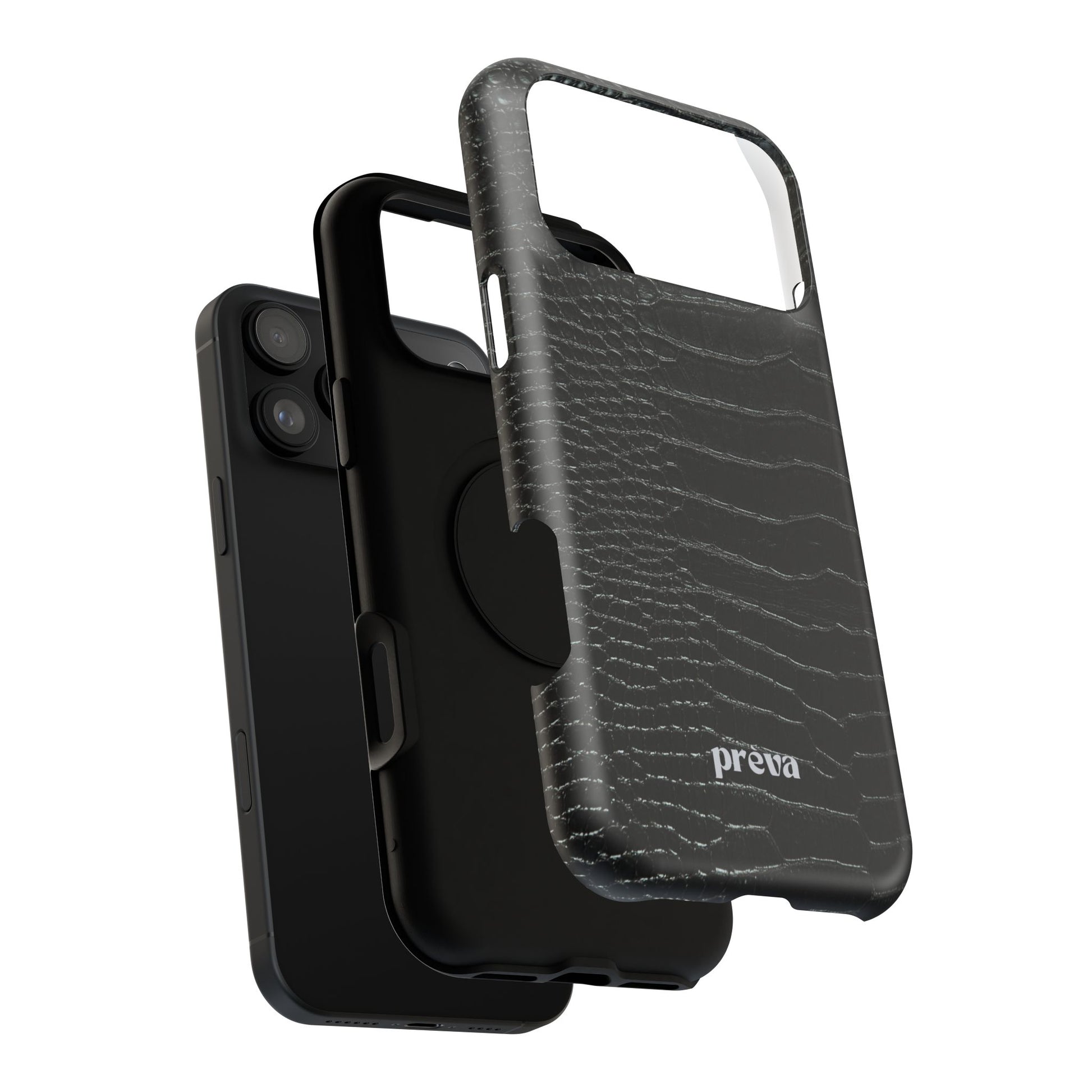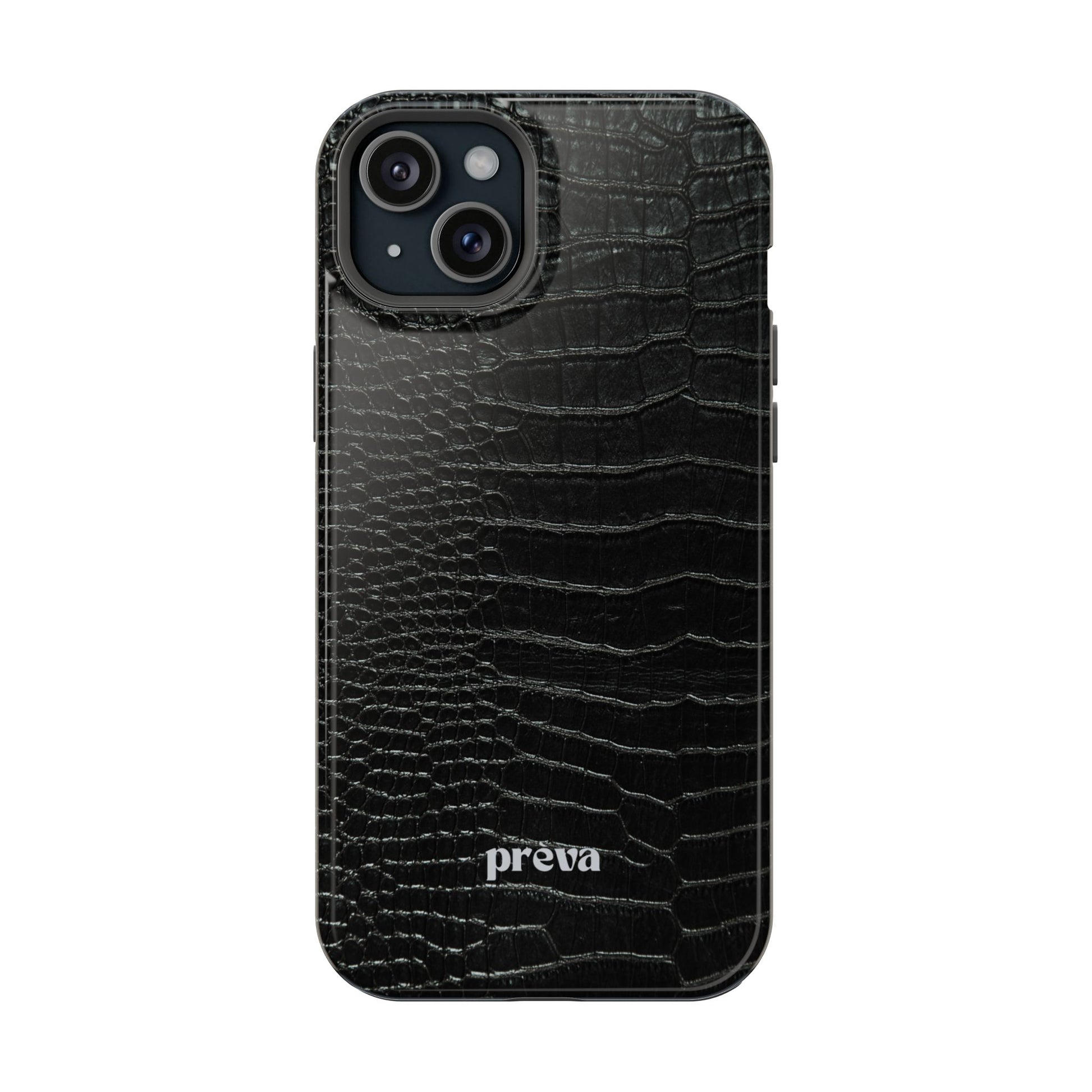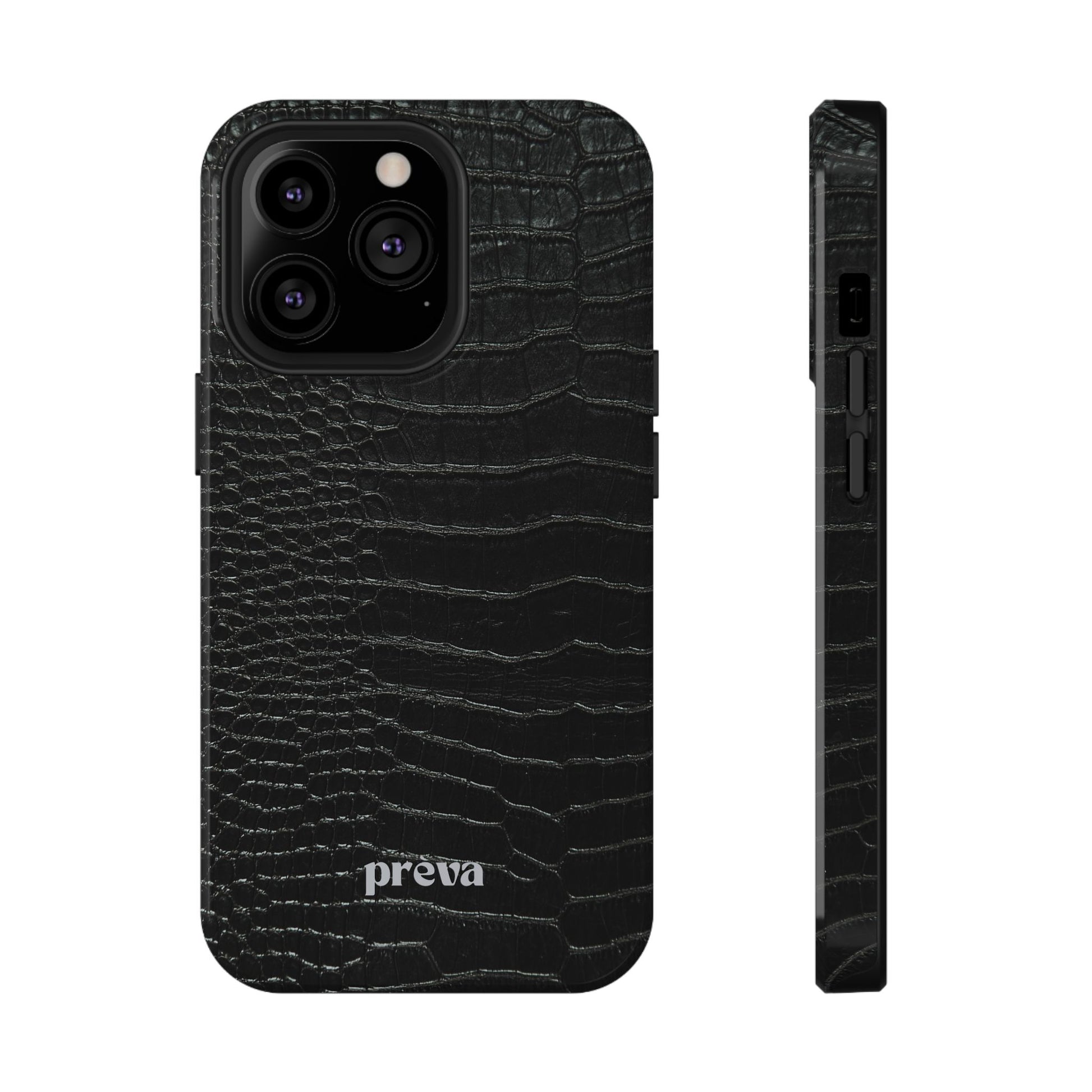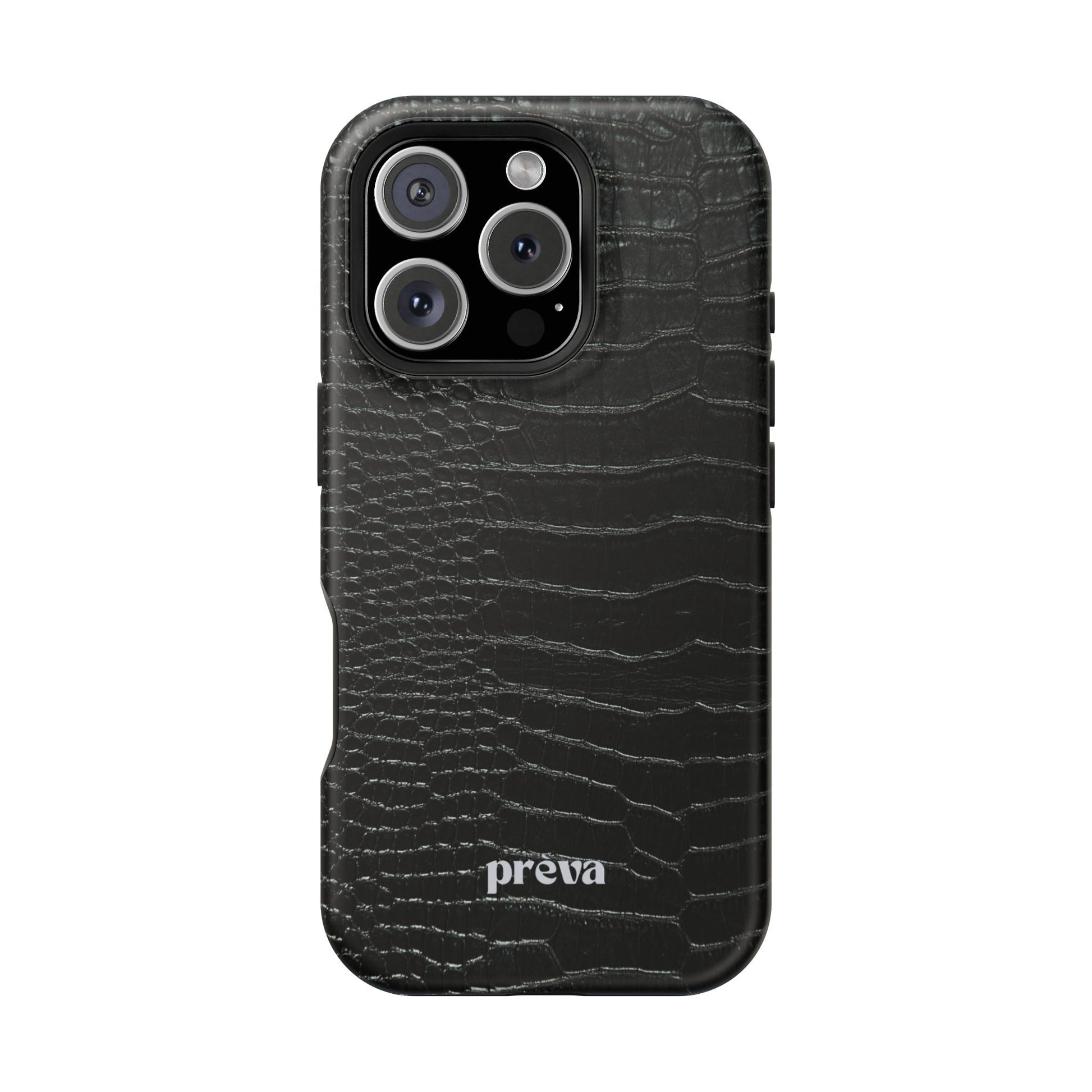 This slim, impact-resistant phone case brings understated luxury to everyday carry. The black crocodile-embossed finish reads like wearable leather, while the dual-layer construction—rigid polycarbonate shell with a removable TPU liner—gives confidence against drops and scuffs. Full-wrap printing keeps the textured pattern seamless around edges. Choose a glossy sheen for a sleek, reflective look or a matte finish for muted sophistication. It’s crafted for tactile grip, supports wireless charging, and fits the latest iPhone models so your device looks refined and stays protected without bulk.