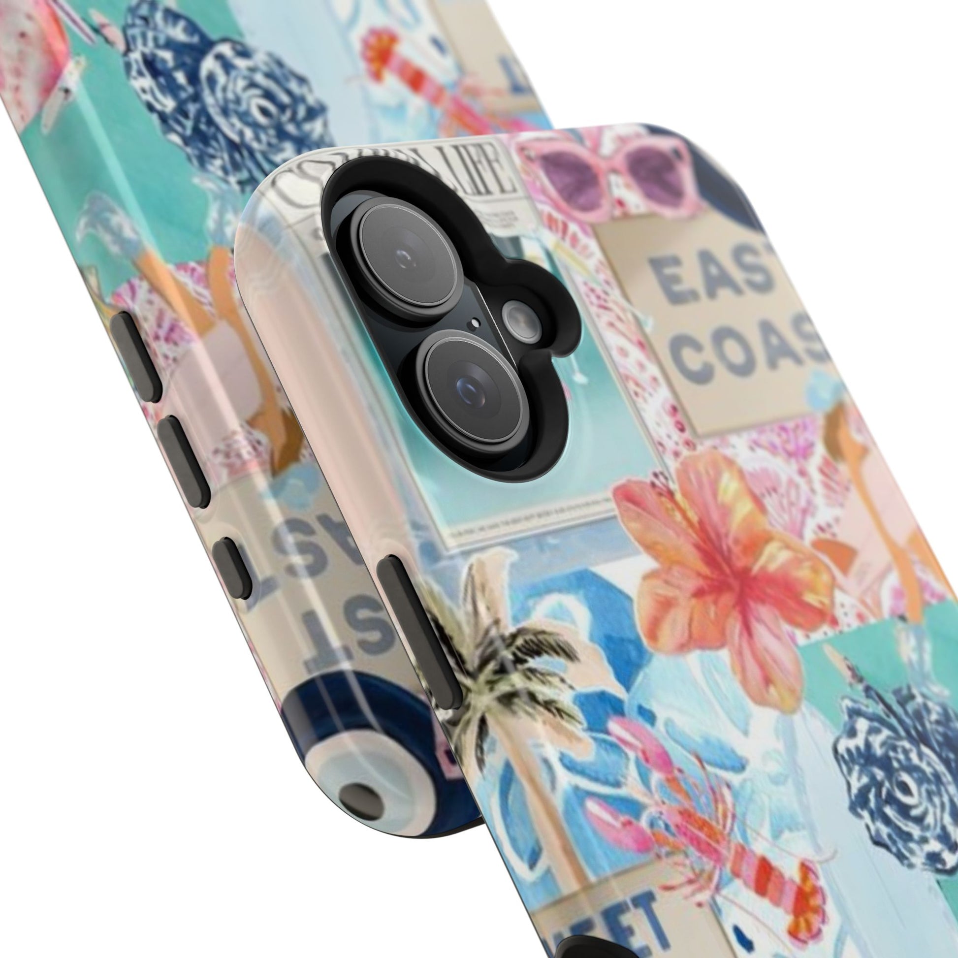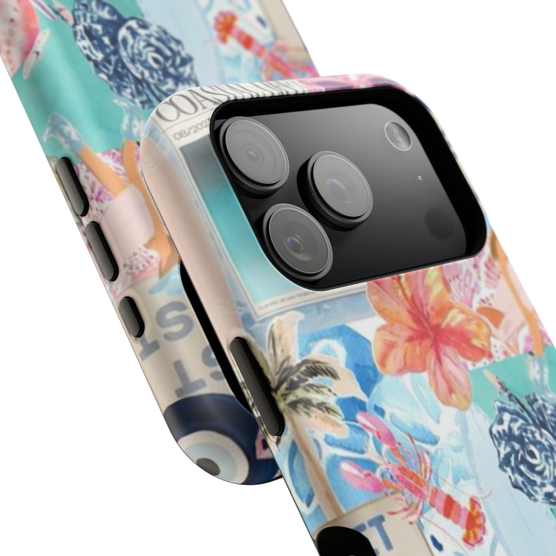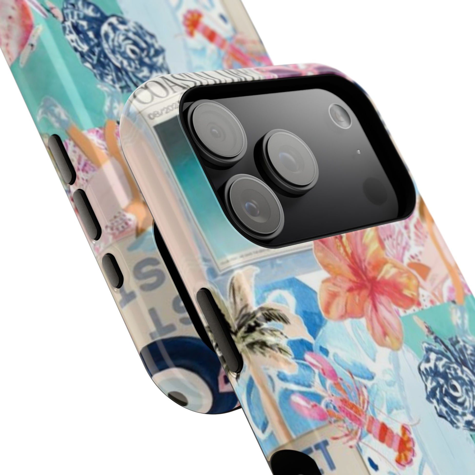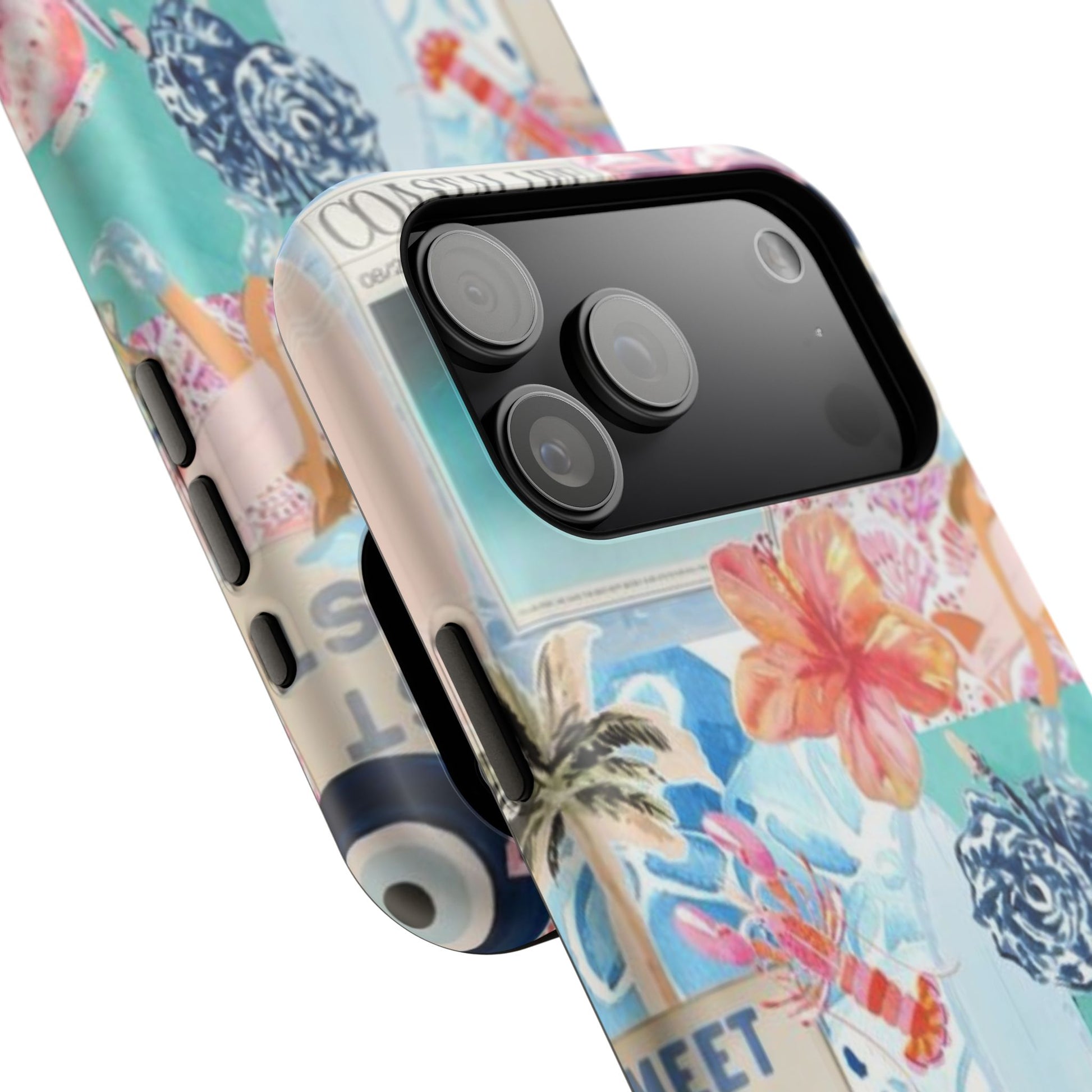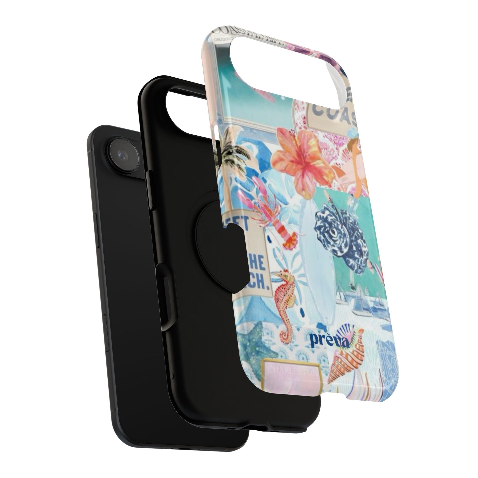 A vibrant, impact-resistant phone case that brings sun-soaked coastal energy to your everyday carry. Lightweight yet protective, this dual-layer case wraps your phone in bright, photo-quality artwork: hibiscus blooms, surfboards, playful seahorses, and retro East Coast signage layered like a travel scrapbook. The removable black TPU inner liner cushions shocks while the rigid polycarbonate shell resists scratches and holds the full-wrap print with crisp, saturated color. Choose glossy for a luminous sheen or matte for a soft, tactile finish. It slips easily into a bag, supports wireless charging, and fits new iPhone 17 series models—so your phone looks like summer and stays guarded wherever you go.