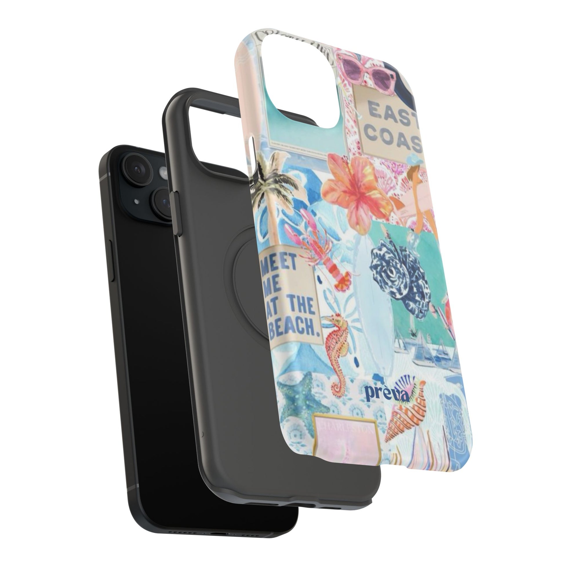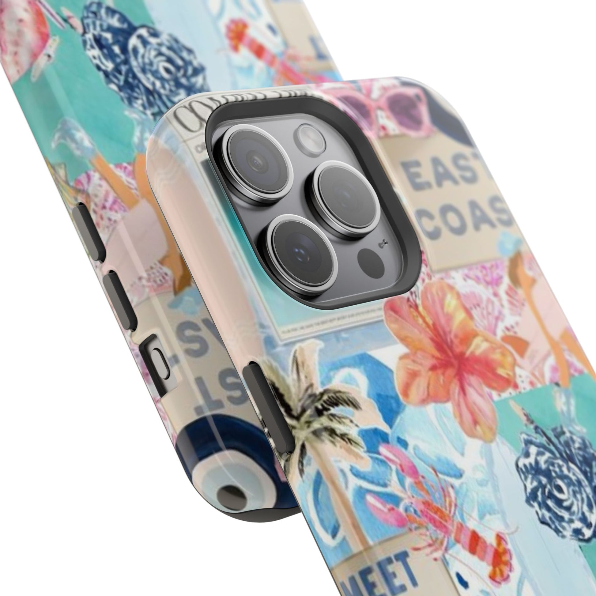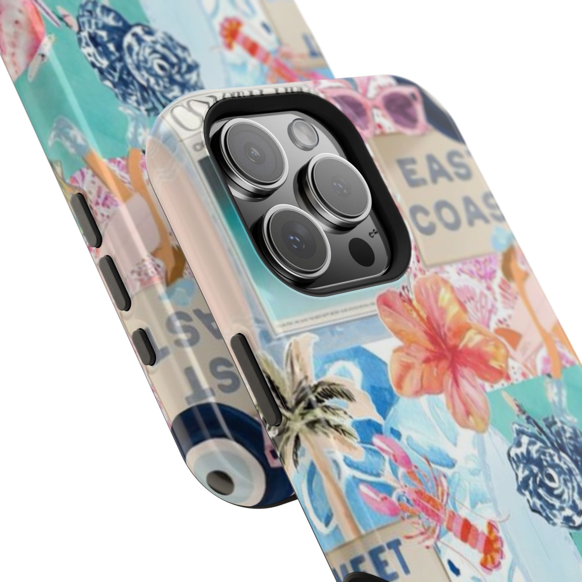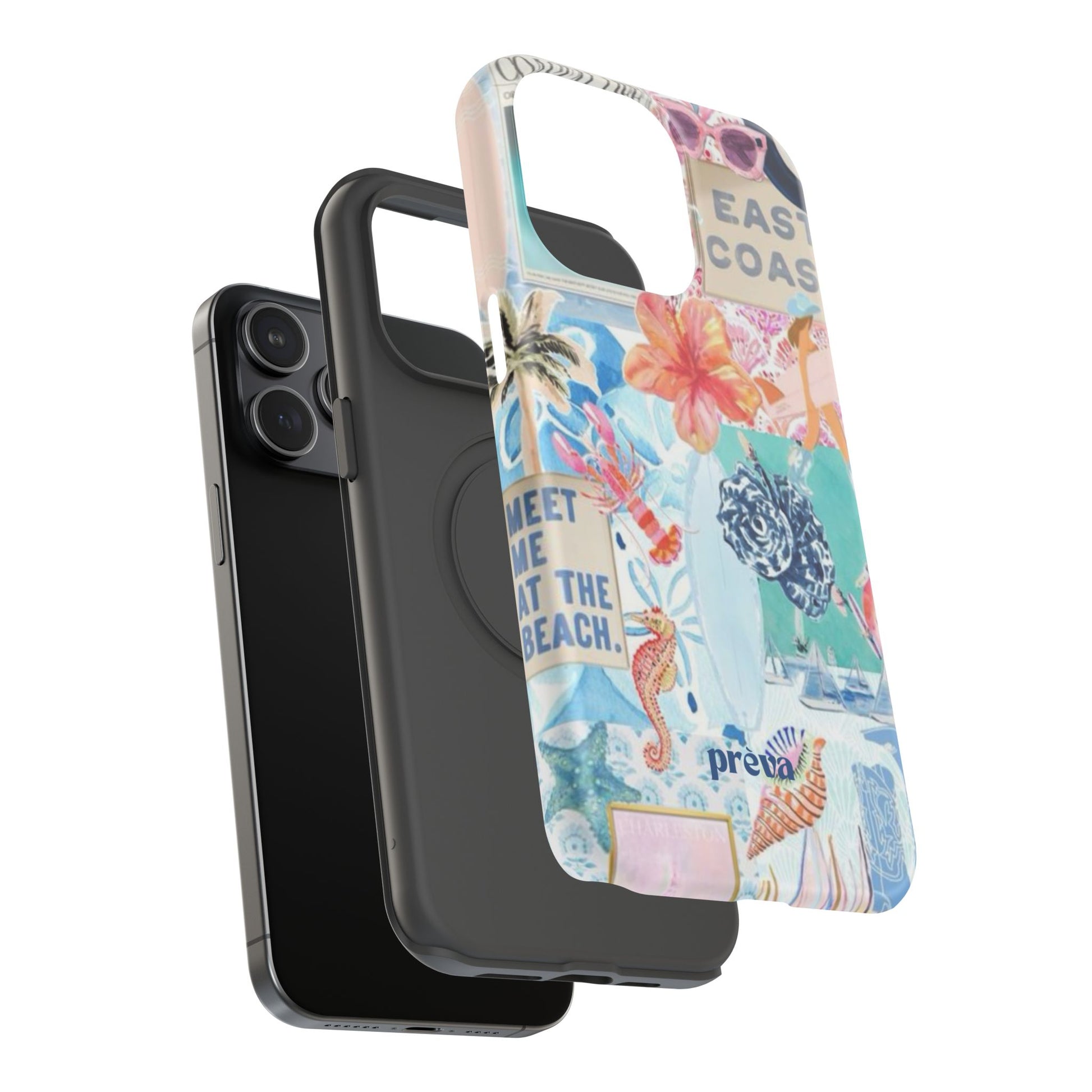 A vibrant, impact-resistant phone case that brings sun-soaked coastal energy to your everyday carry. Lightweight yet protective, this dual-layer case wraps your phone in bright, photo-quality artwork: hibiscus blooms, surfboards, playful seahorses, and retro East Coast signage layered like a travel scrapbook. The removable black TPU inner liner cushions shocks while the rigid polycarbonate shell resists scratches and holds the full-wrap print with crisp, saturated color. Choose glossy for a luminous sheen or matte for a soft, tactile finish. It slips easily into a bag, supports wireless charging, and fits new iPhone 17 series models—so your phone looks like summer and stays guarded wherever you go.