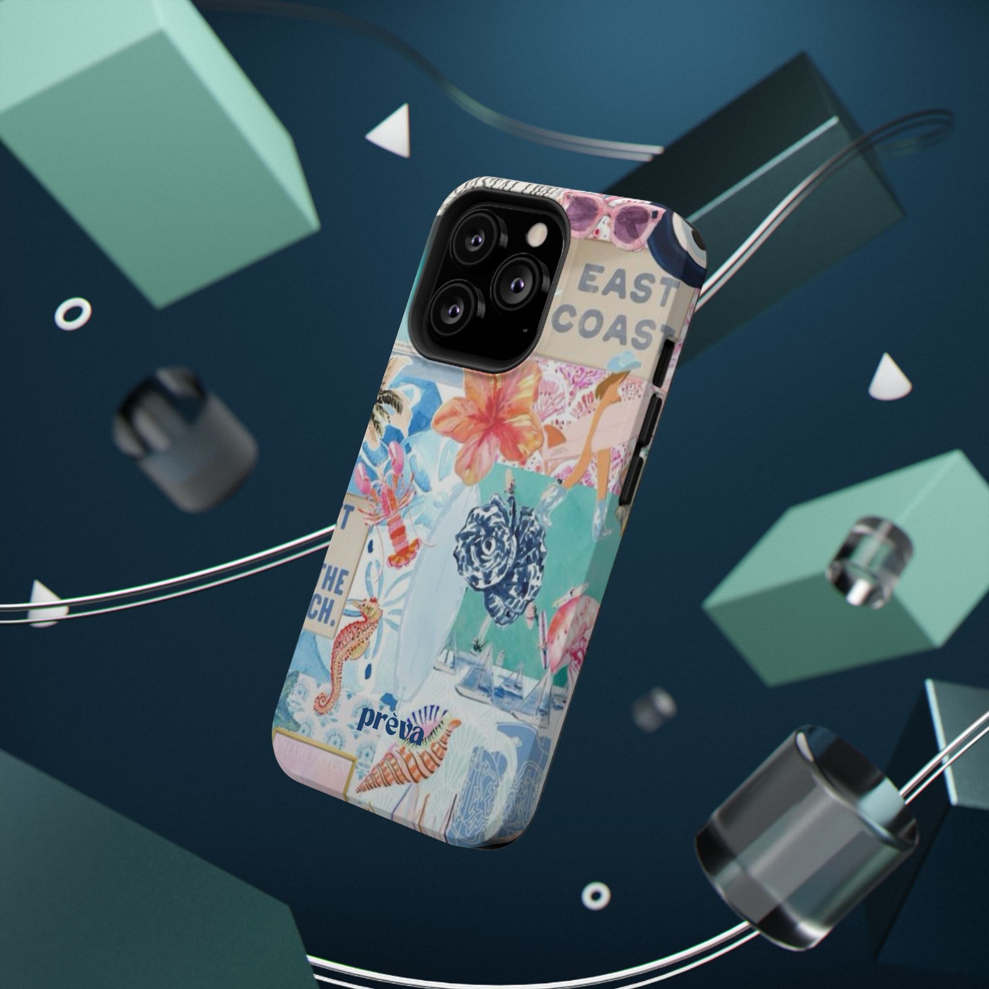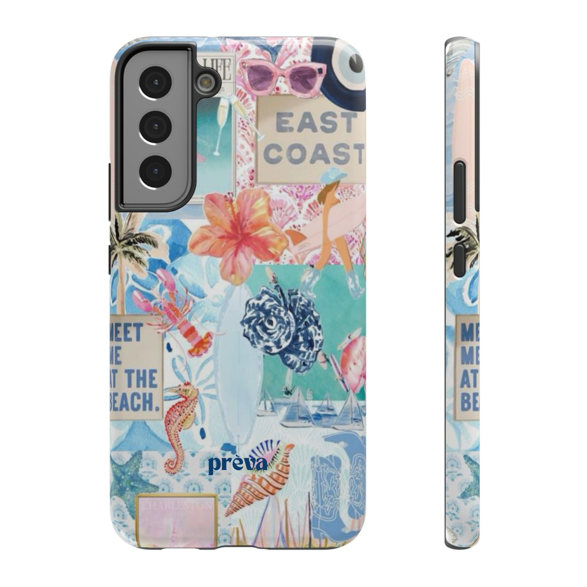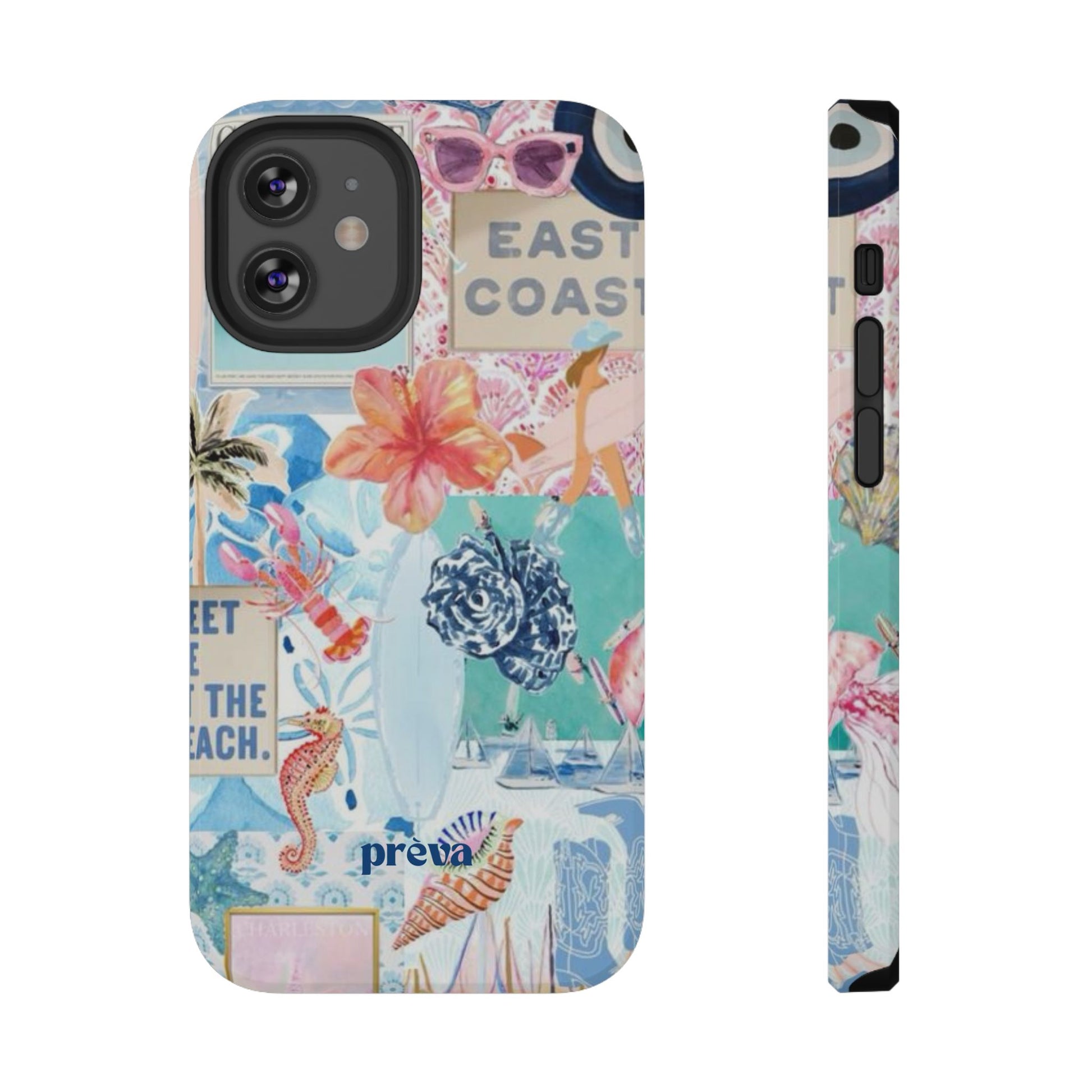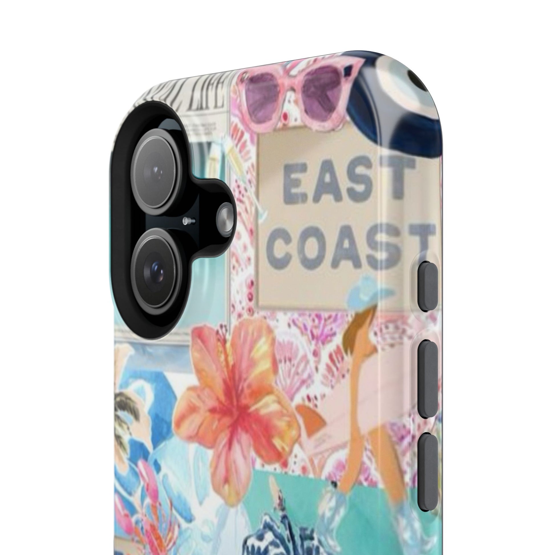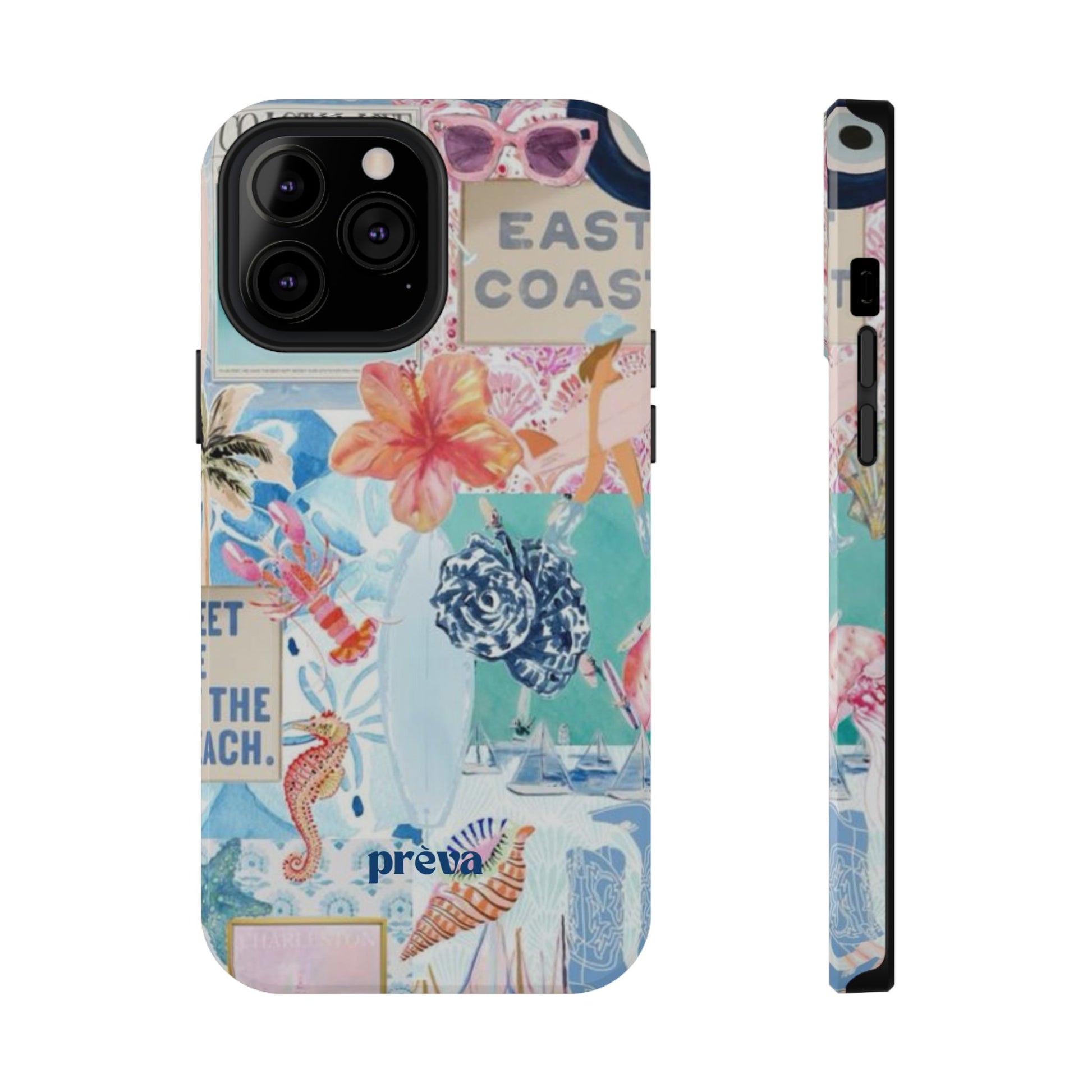 A vibrant, impact-resistant phone case that brings sun-soaked coastal energy to your everyday carry. Lightweight yet protective, this dual-layer case wraps your phone in bright, photo-quality artwork: hibiscus blooms, surfboards, playful seahorses, and retro East Coast signage layered like a travel scrapbook. The removable black TPU inner liner cushions shocks while the rigid polycarbonate shell resists scratches and holds the full-wrap print with crisp, saturated color. Choose glossy for a luminous sheen or matte for a soft, tactile finish. It slips easily into a bag, supports wireless charging, and fits new iPhone 17 series models—so your phone looks like summer and stays guarded wherever you go.