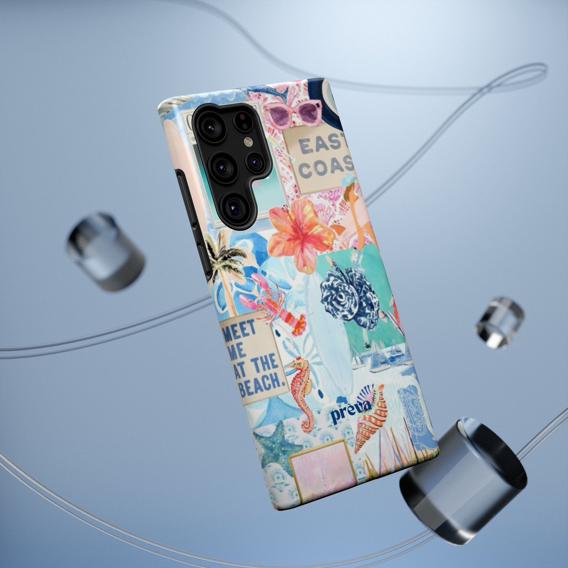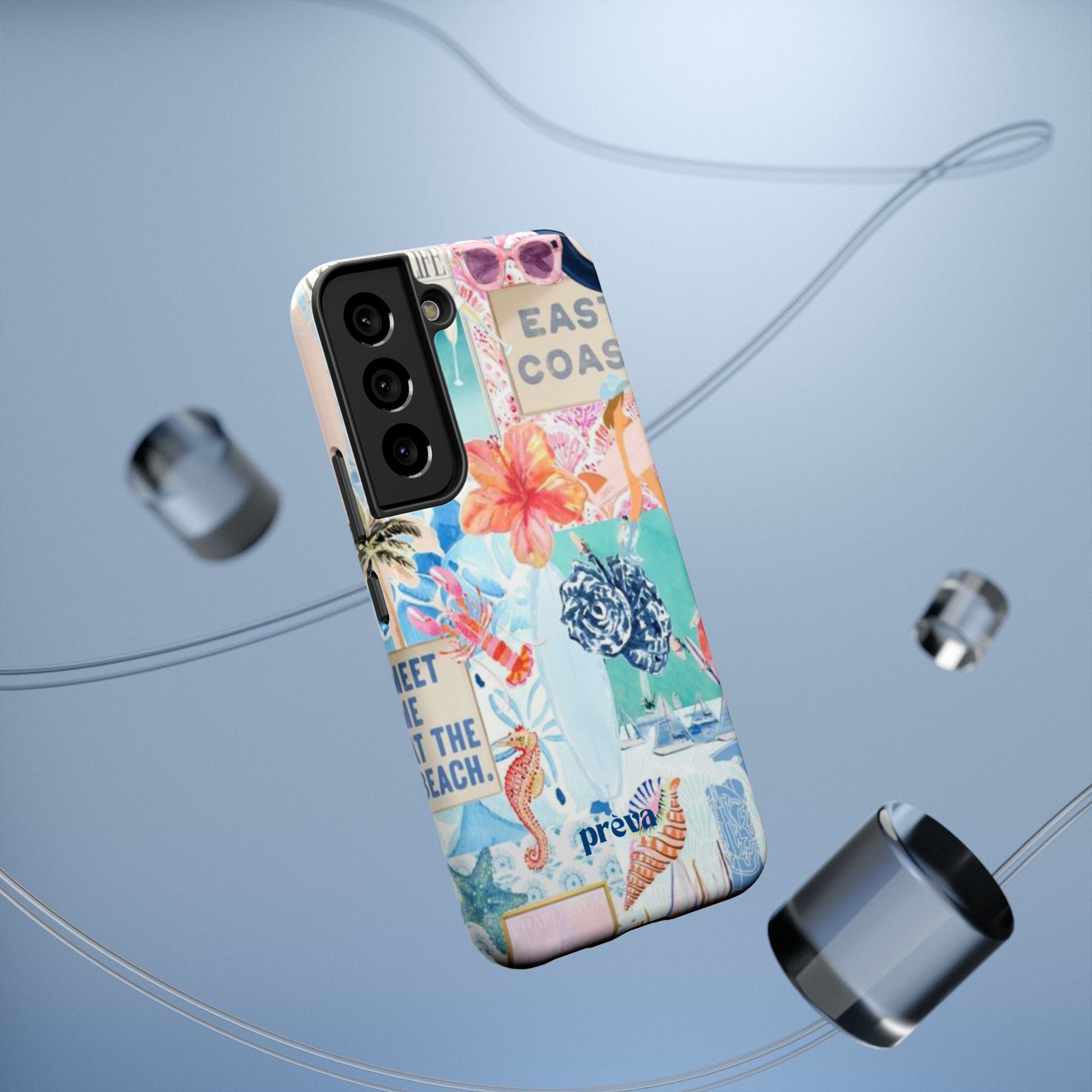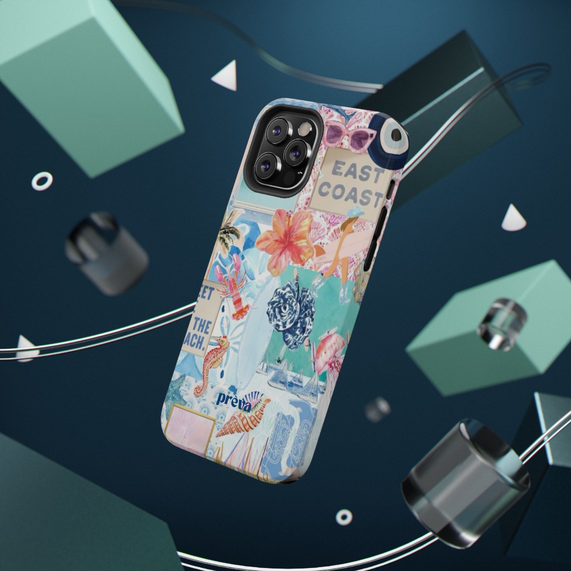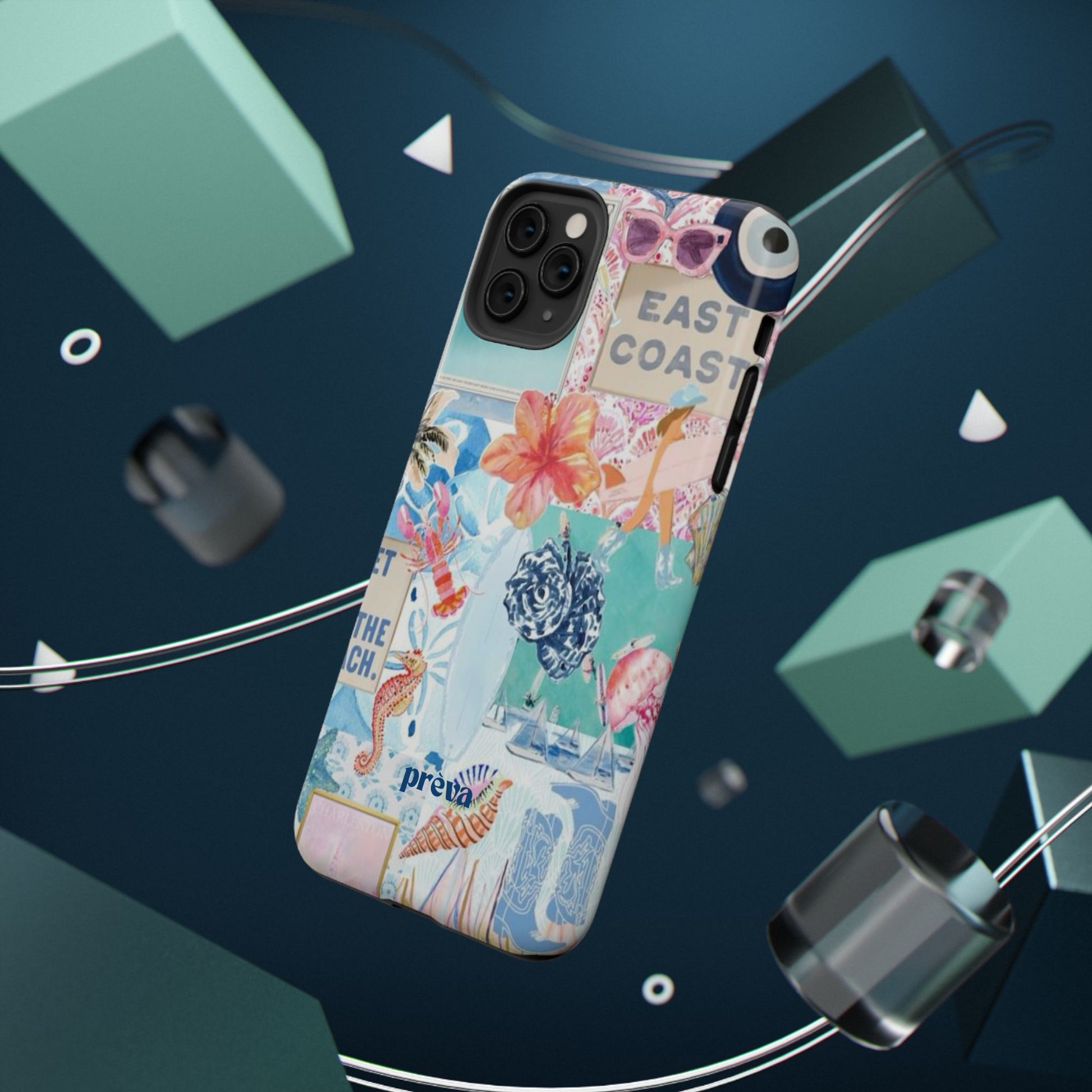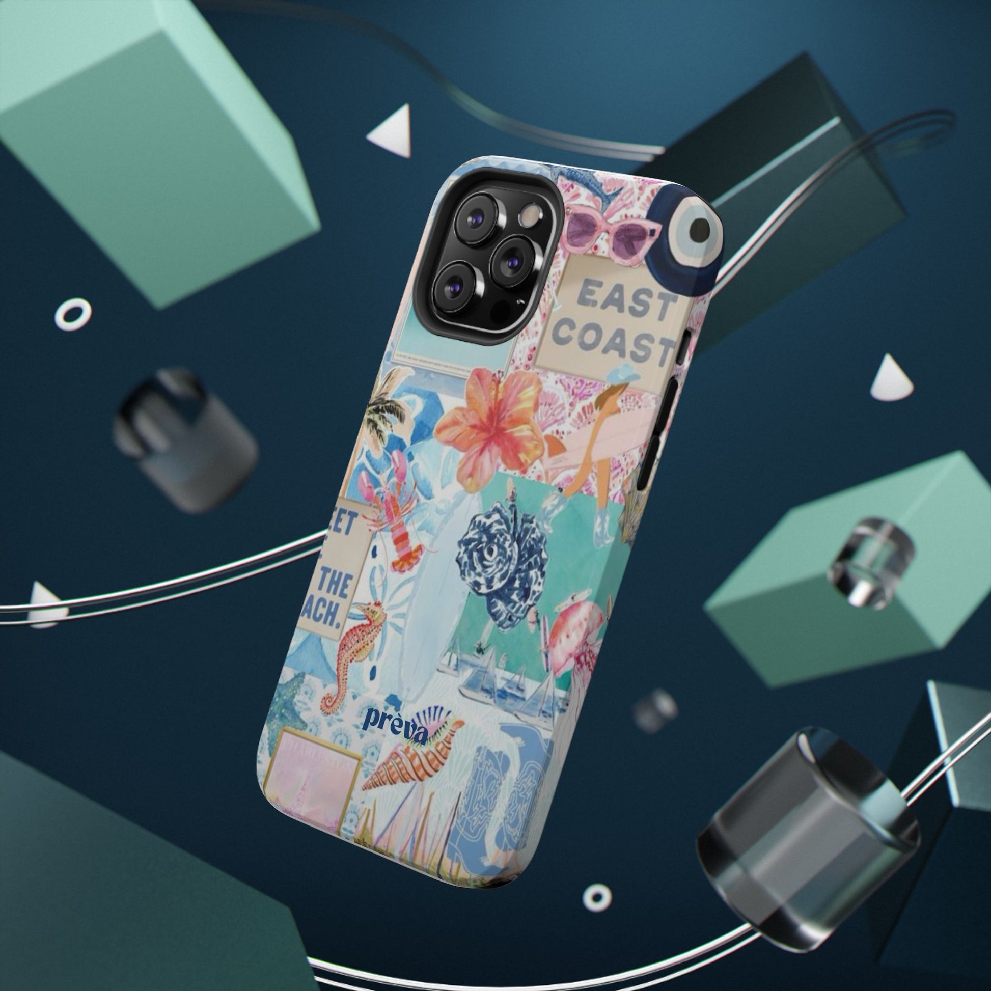 A vibrant, impact-resistant phone case that brings sun-soaked coastal energy to your everyday carry. Lightweight yet protective, this dual-layer case wraps your phone in bright, photo-quality artwork: hibiscus blooms, surfboards, playful seahorses, and retro East Coast signage layered like a travel scrapbook. The removable black TPU inner liner cushions shocks while the rigid polycarbonate shell resists scratches and holds the full-wrap print with crisp, saturated color. Choose glossy for a luminous sheen or matte for a soft, tactile finish. It slips easily into a bag, supports wireless charging, and fits new iPhone 17 series models—so your phone looks like summer and stays guarded wherever you go.