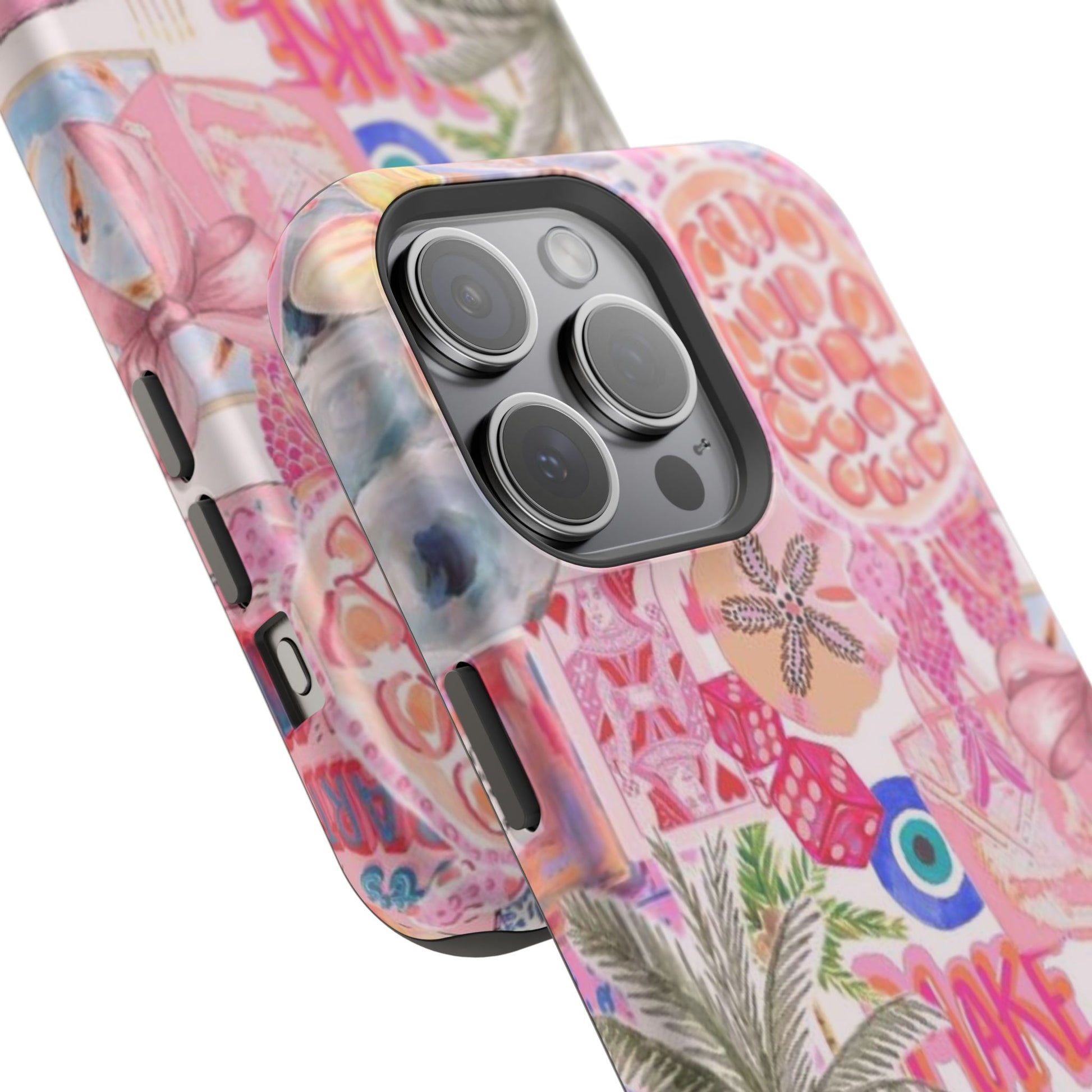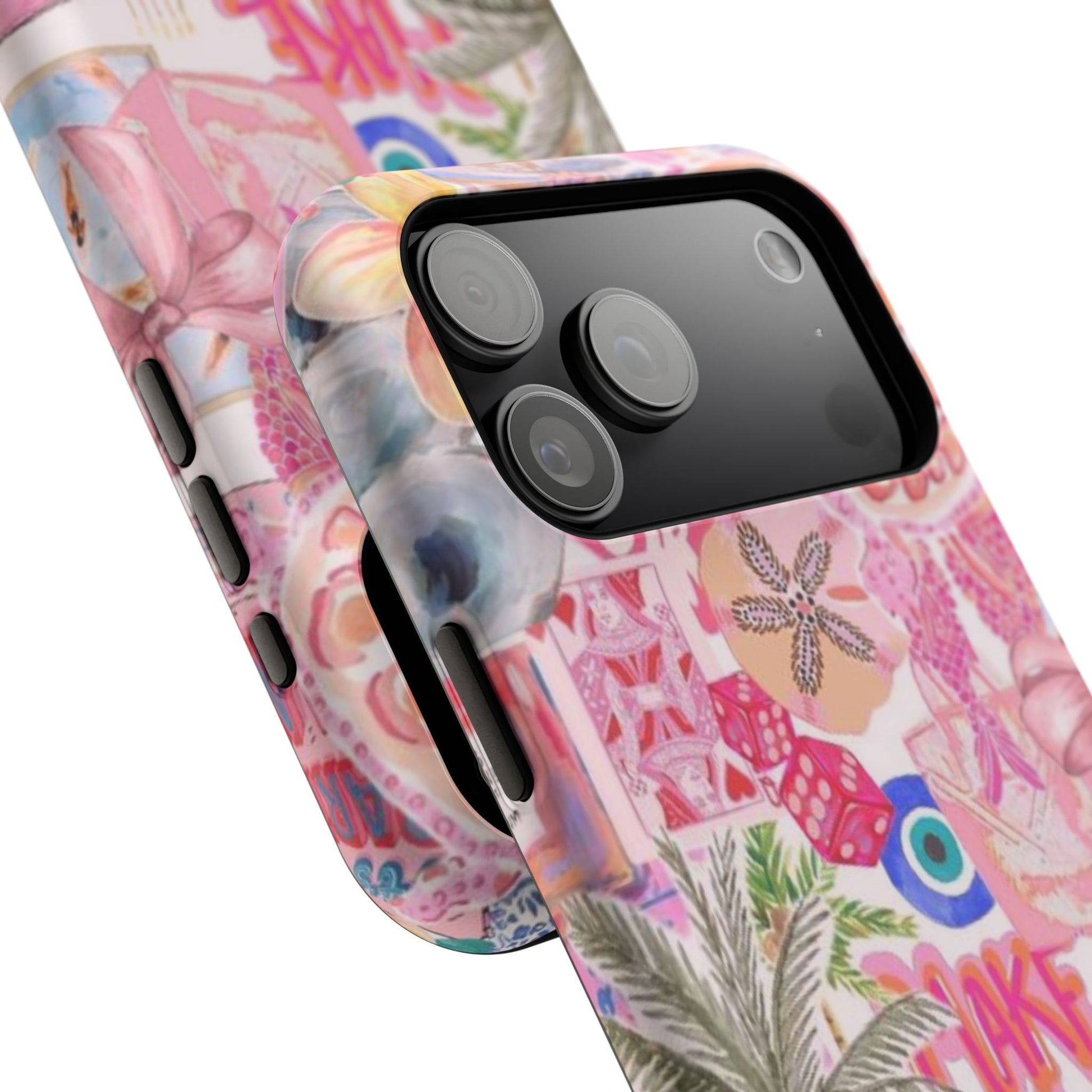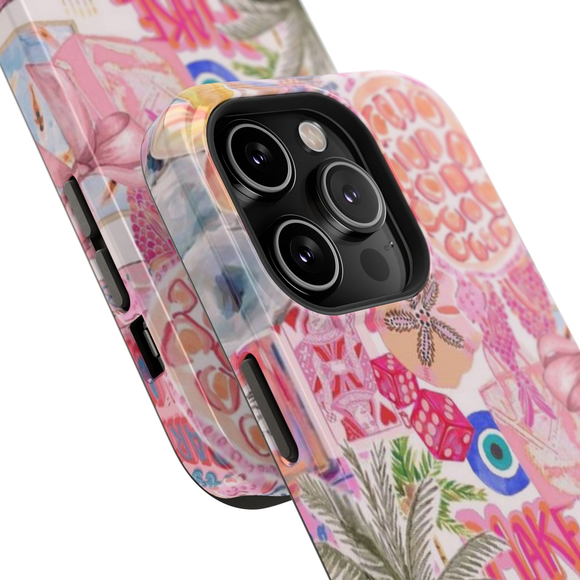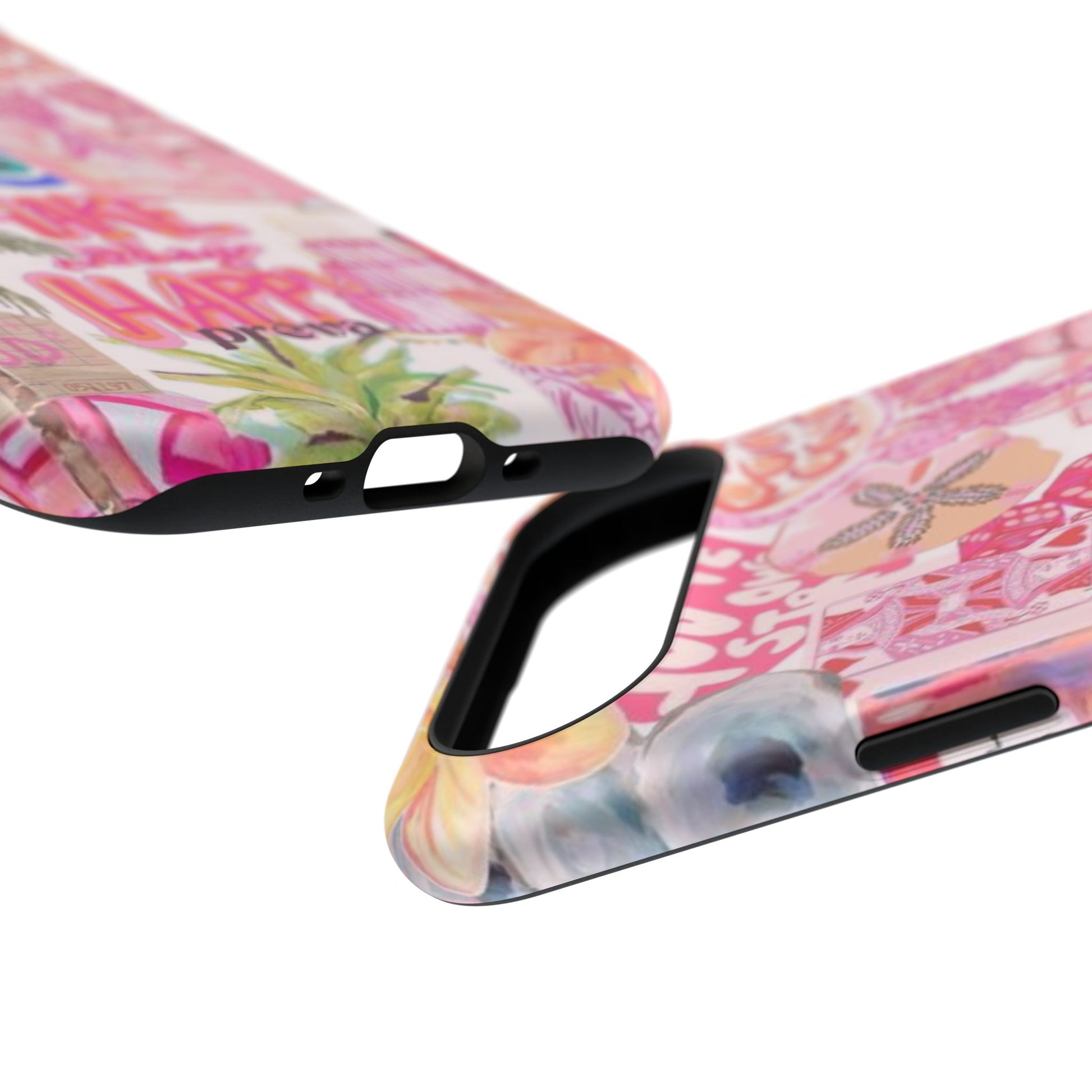 Wrap your phone in sunlit color and playful texture. This impact-resistant phone case blends glossy or matte finishes with a vivid, full-wrap collage of palm fronds, tropical flowers, and upbeat lettering — a small daily reminder to chase warm days and colorful moments. The dual-layer design pairs a rigid polycarbonate shell with a flexible black TPU liner to absorb shocks while keeping a slim profile. It prints at high resolution so every brush stroke and pastel tone stays crisp, and it supports wireless charging so you don’t sacrifice convenience for style. Slip it on and let your phone feel like a pocket-sized mood board that travels with you.