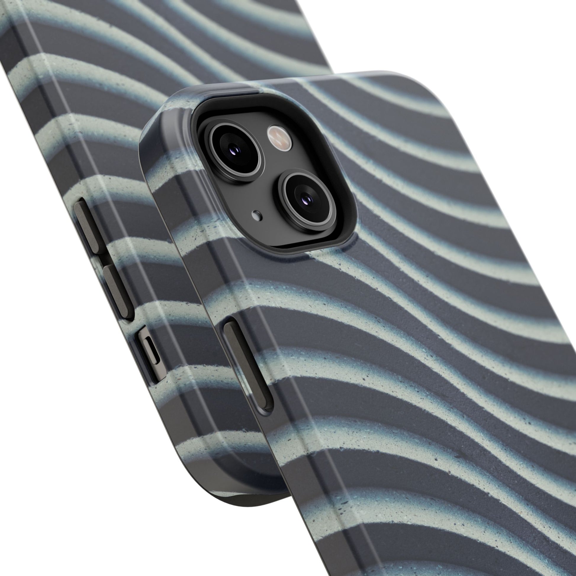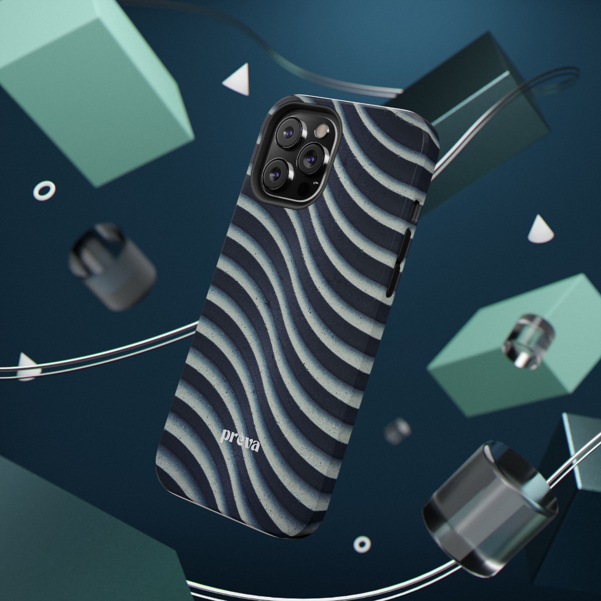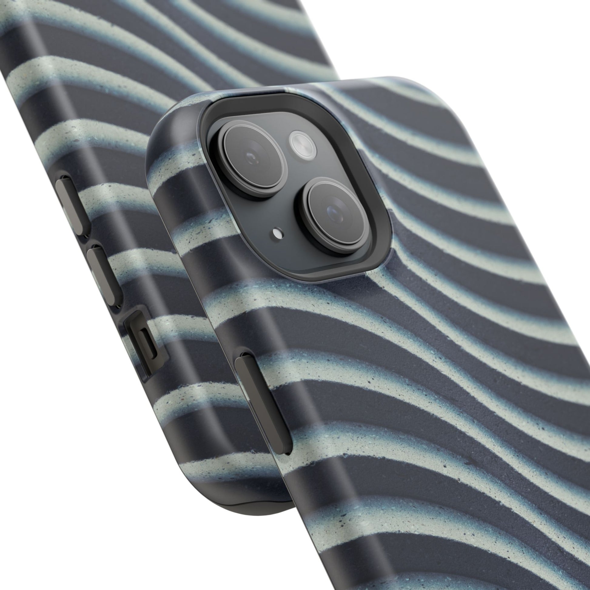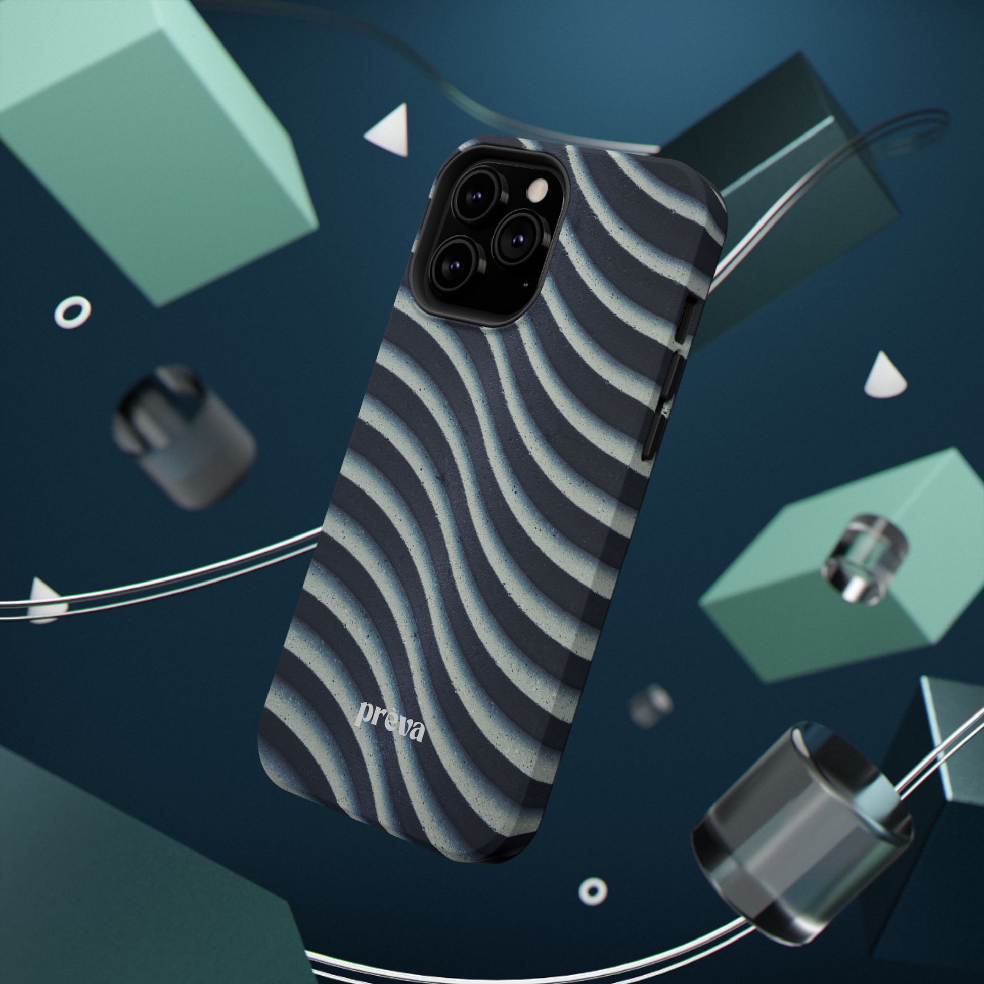 Sculpted waves ripple across this impact-resistant phone case, catching light in a deep, matte-ready finish. The design feels modern and tactile — like a quiet architecture for your pocket. The dual-layer construction gives weight and reassurance without bulk, while wireless charging stays effortless. Slip it on before a commute or creative meet-up; it wears like a thoughtful detail that complements minimal, design-forward wardrobes.