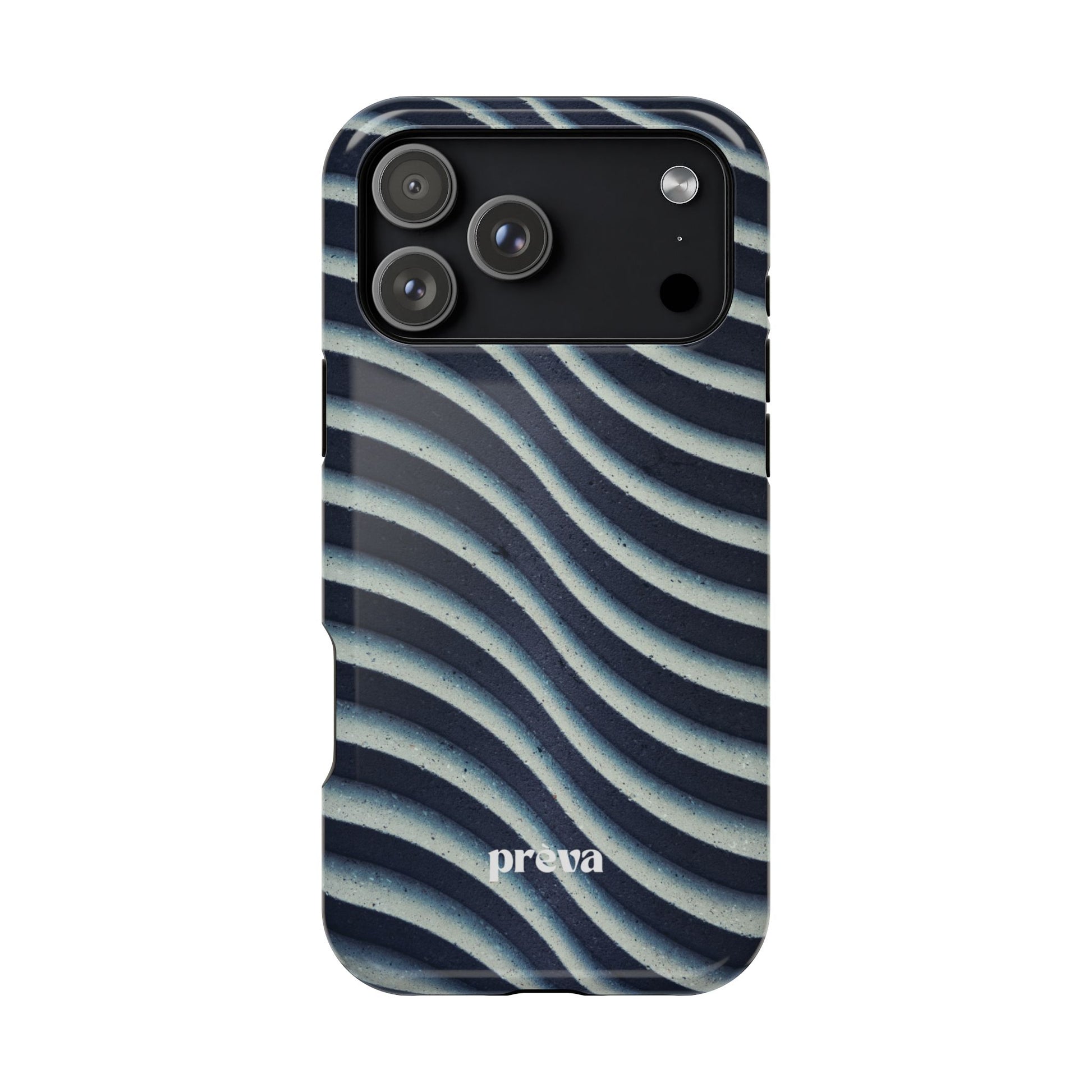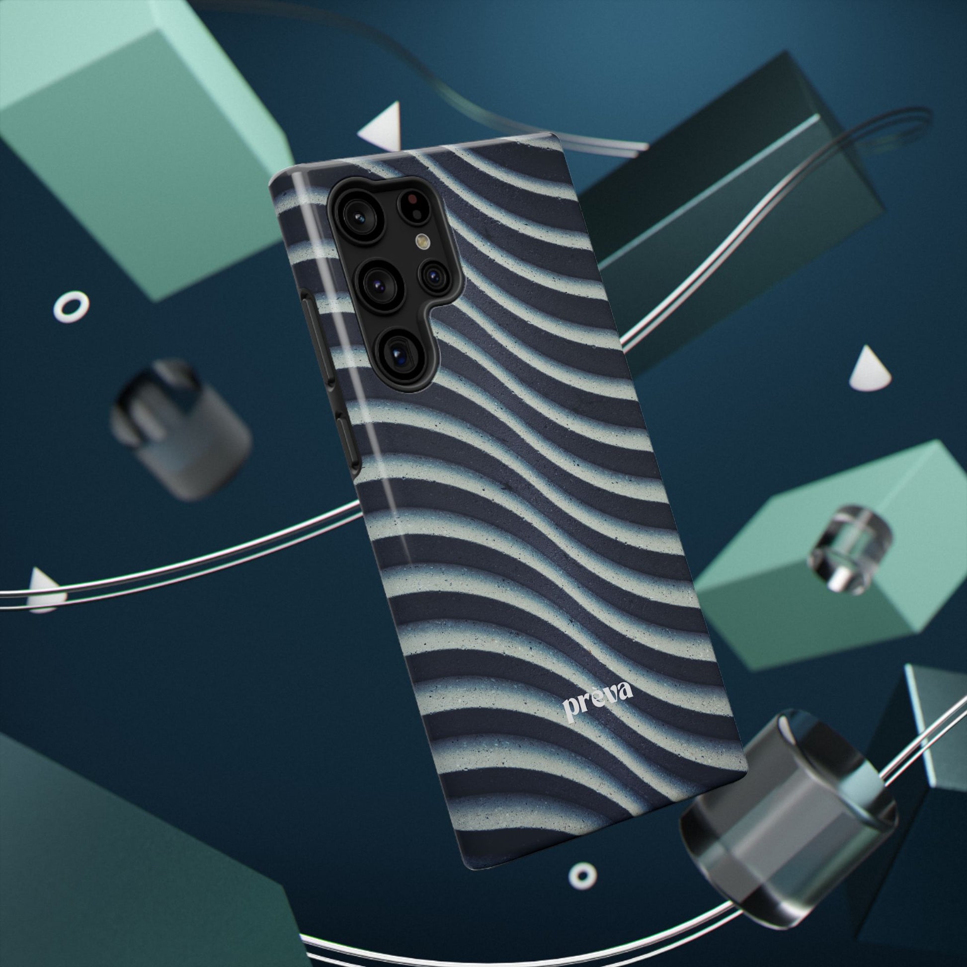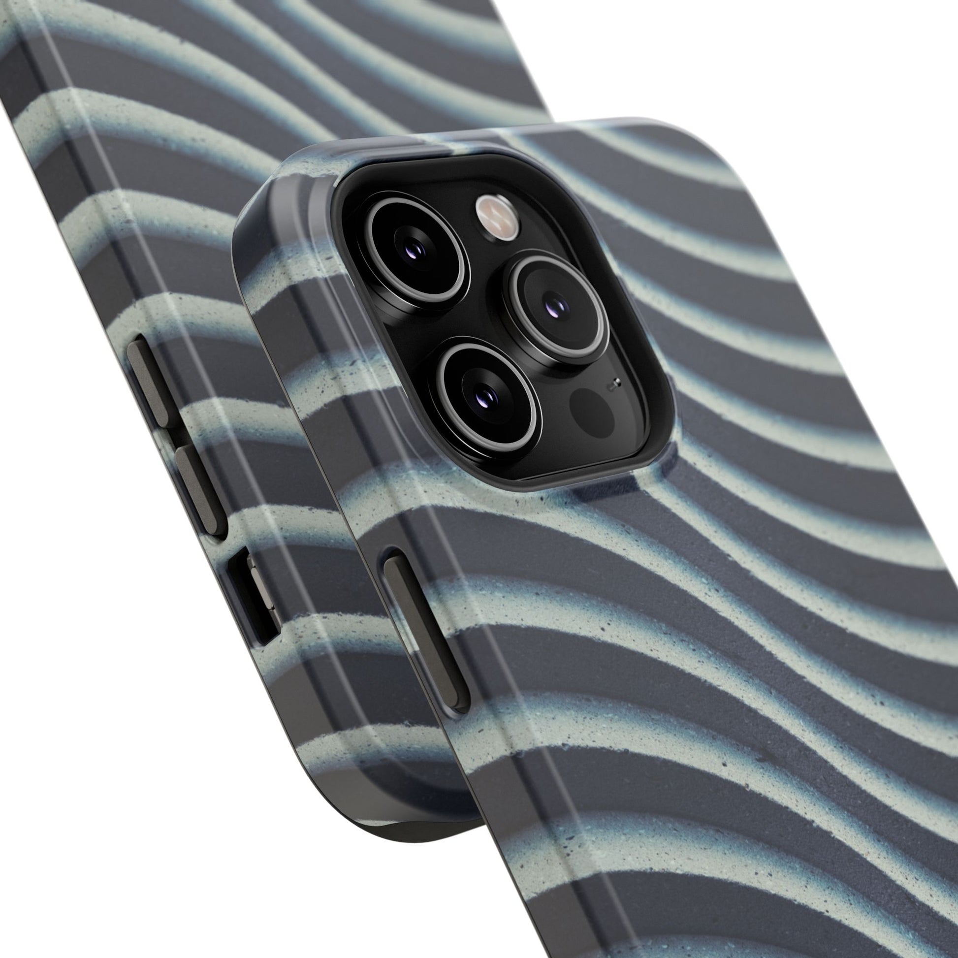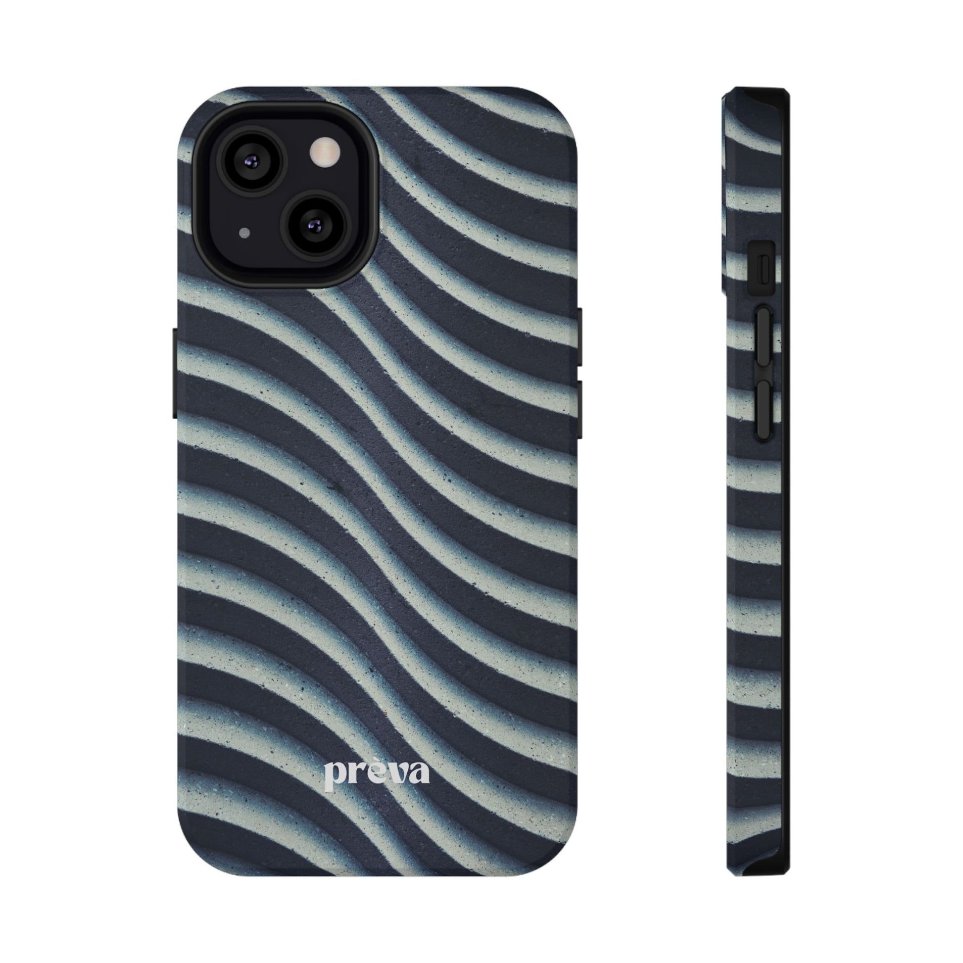 Sculpted waves ripple across this impact-resistant phone case, catching light in a deep, matte-ready finish. The design feels modern and tactile — like a quiet architecture for your pocket. The dual-layer construction gives weight and reassurance without bulk, while wireless charging stays effortless. Slip it on before a commute or creative meet-up; it wears like a thoughtful detail that complements minimal, design-forward wardrobes.