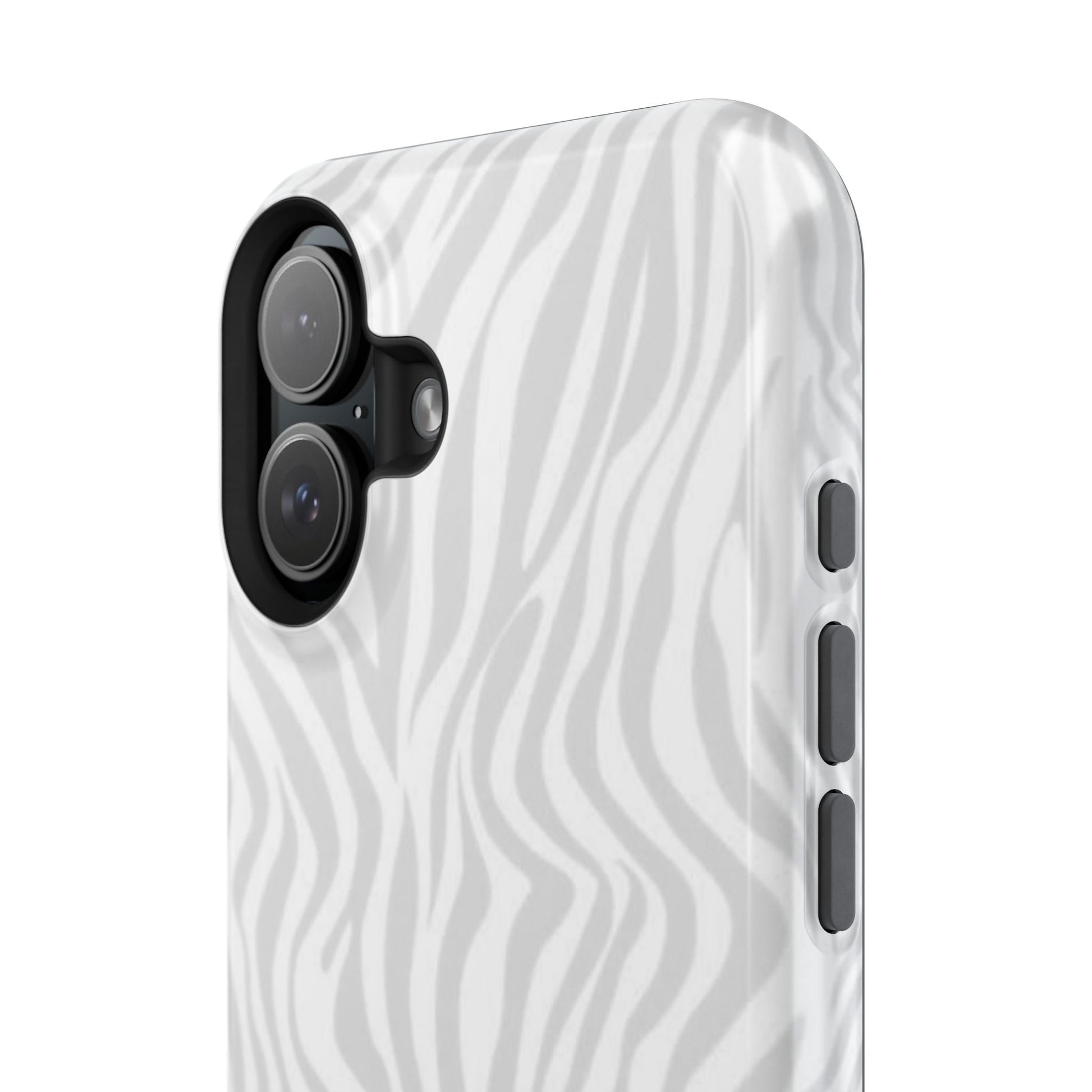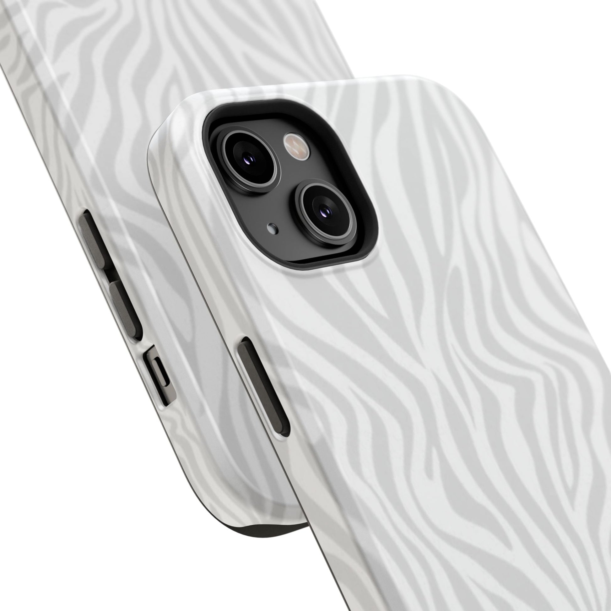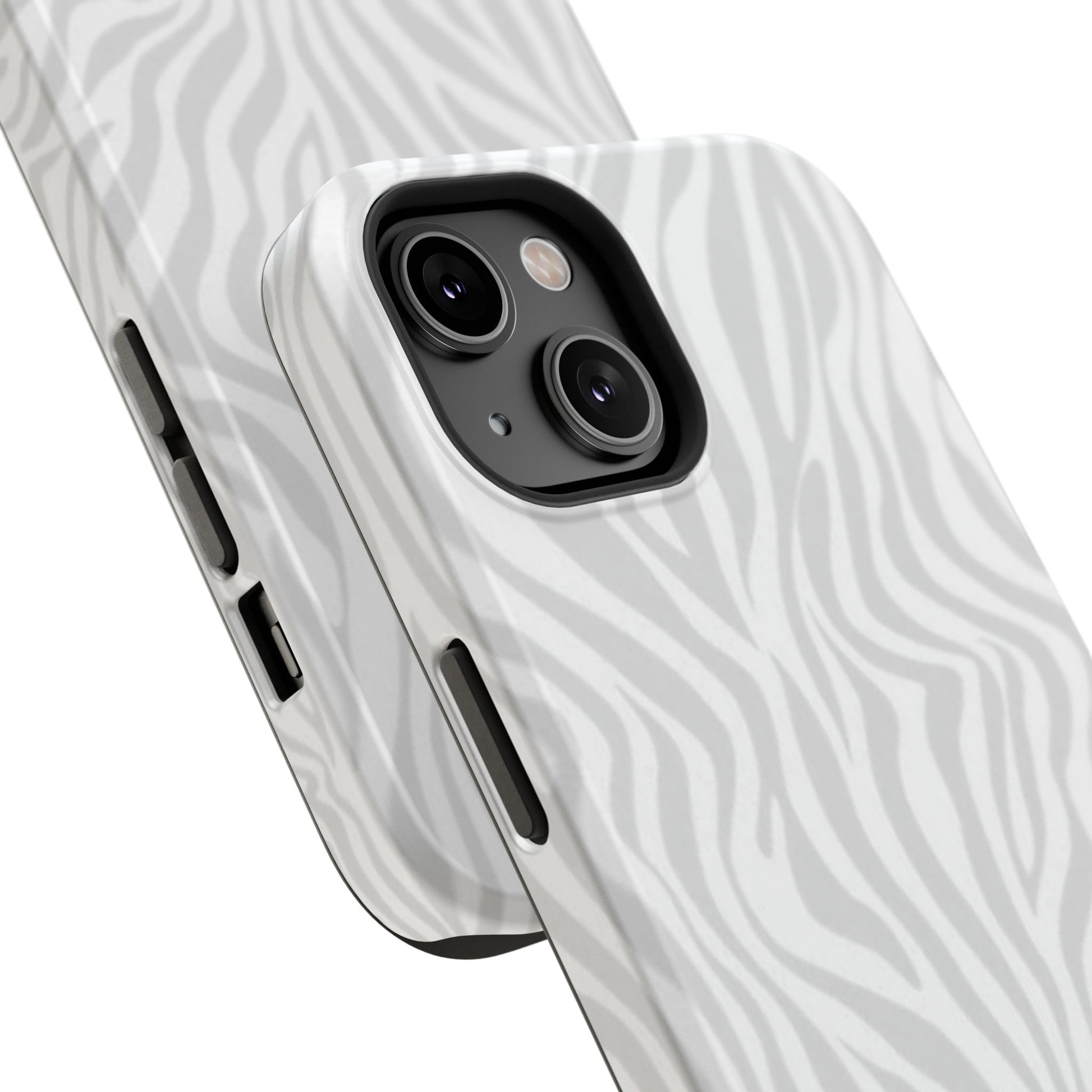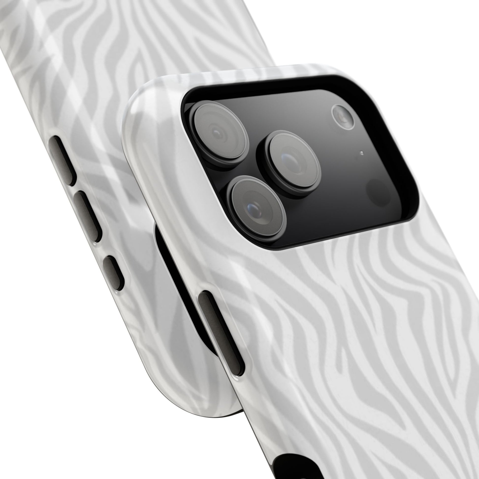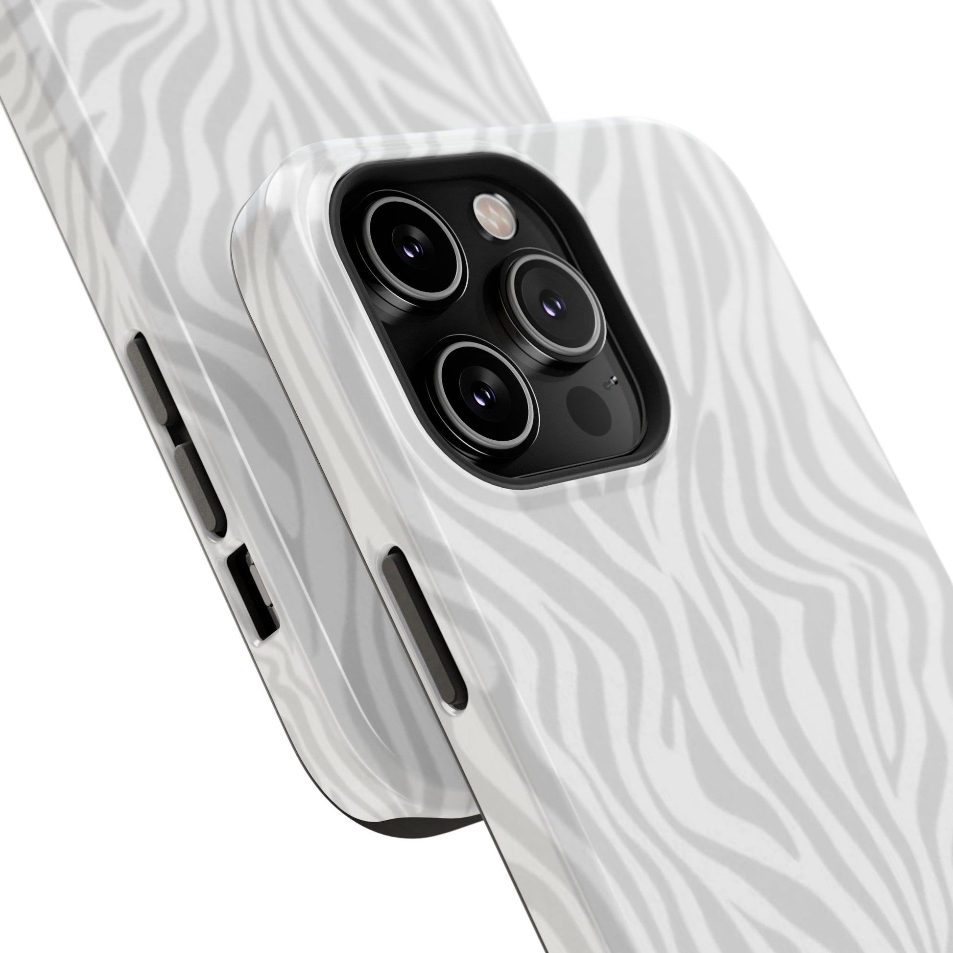 This slim, impact-resistant phone case brings quiet sophistication to everyday carry. A soft, monochrome zebra pattern wraps the exterior in a subtle, textured look that reads understated and modern. The rigid polycarbonate shell and inner TPU liner work together to absorb shocks and resist scratches, while the full-wrap print keeps the design seamless around edges. Choose glossy for a bright, reflective finish or matte for a velvety, low-sheen feel. Lightweight and wireless-charging compatible, it slips into pockets and bags without bulk — built for people who want elevated style and dependable protection during daily commutes, nights out, or travel.
